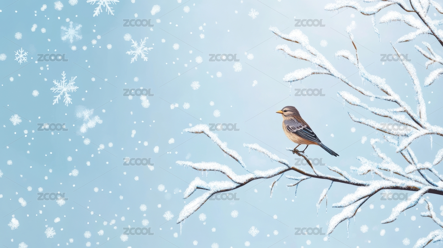 水彩风格下雪的冬天小鸟站在节满果实树枝上