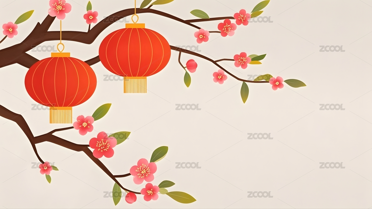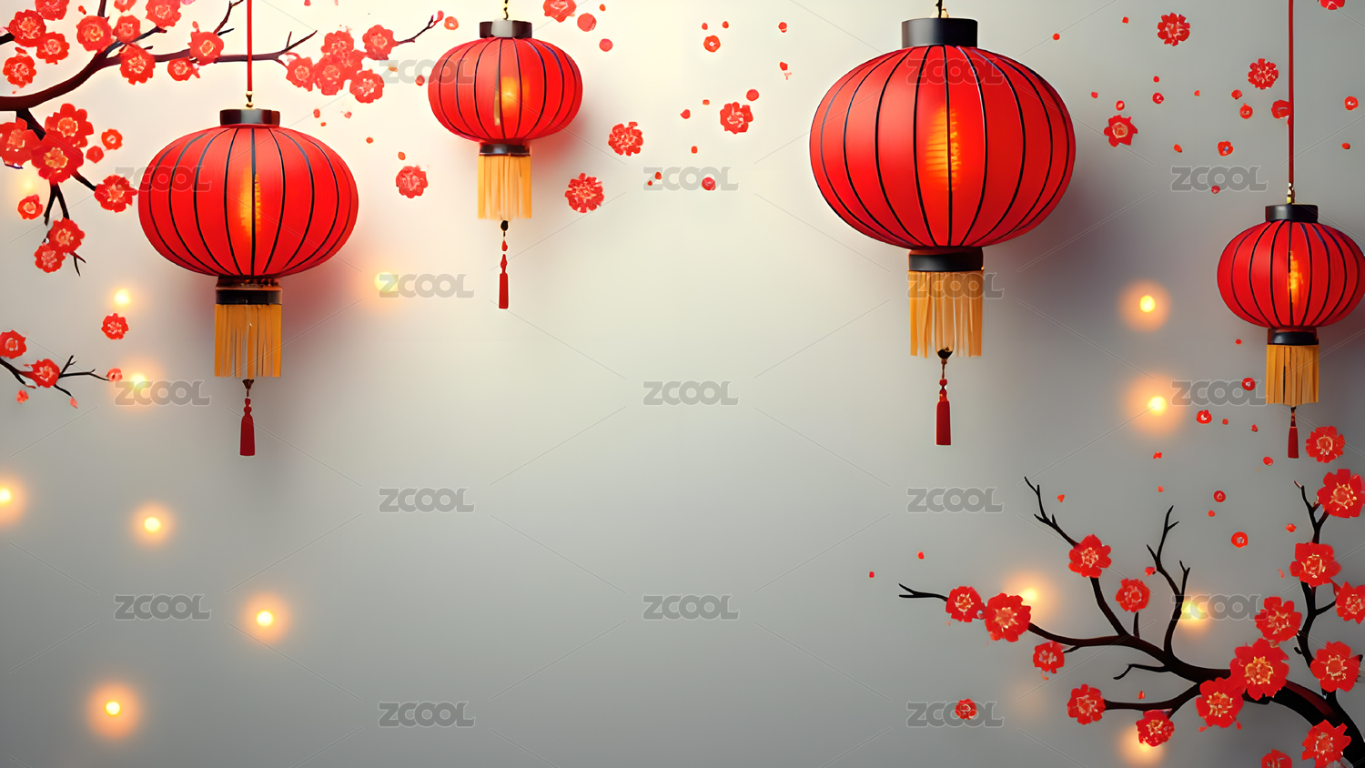 红色喜庆树枝祥云烟花立体剪纸灯笼和花元素
