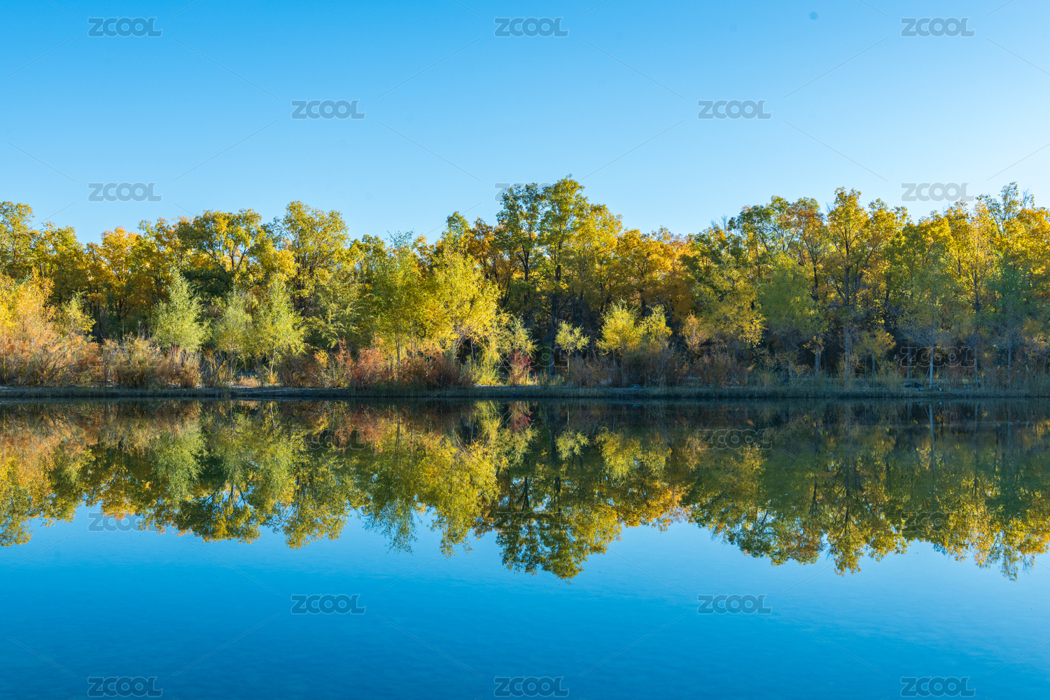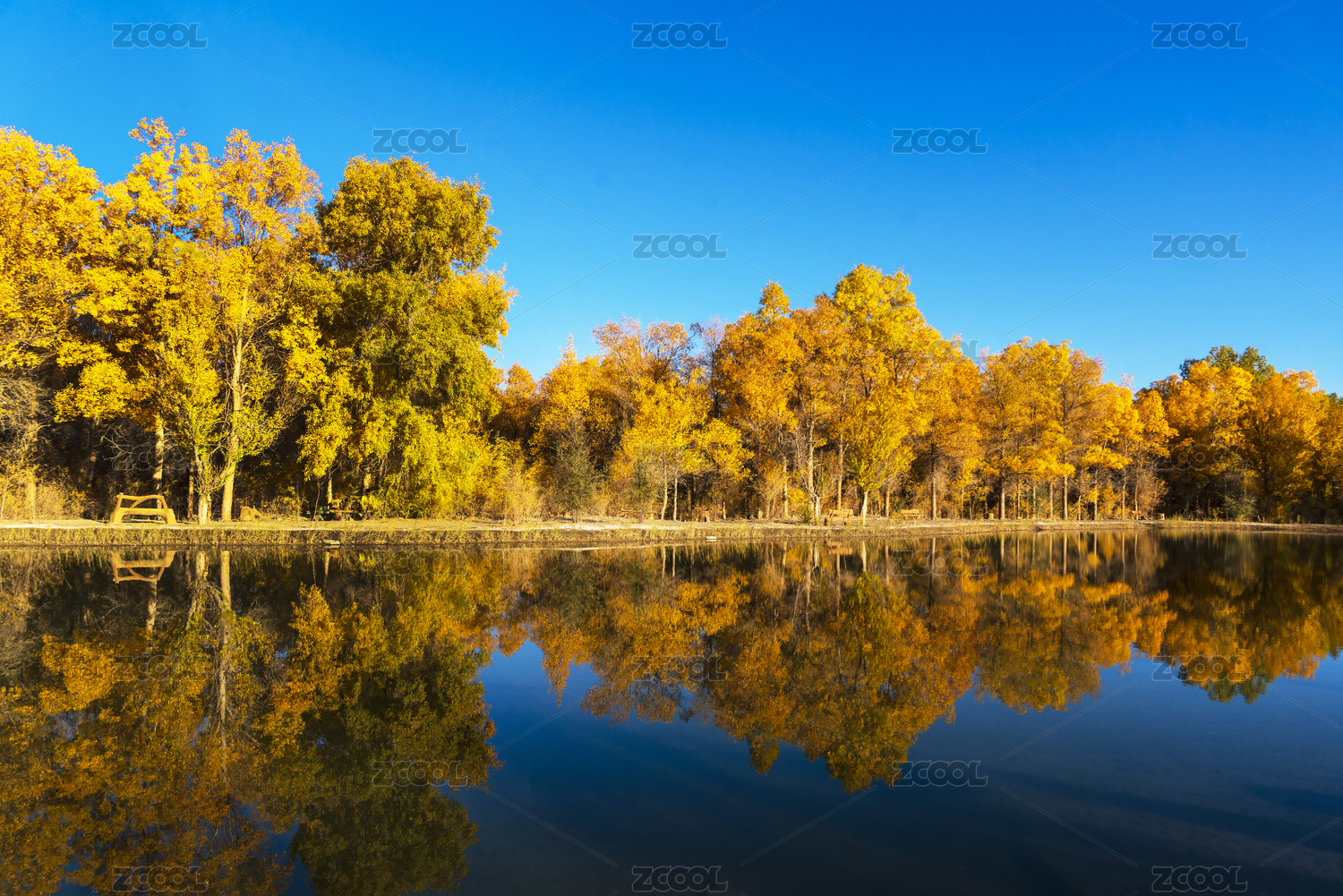 甘肃酒泉金塔胡杨林秋季湖边金色胡杨