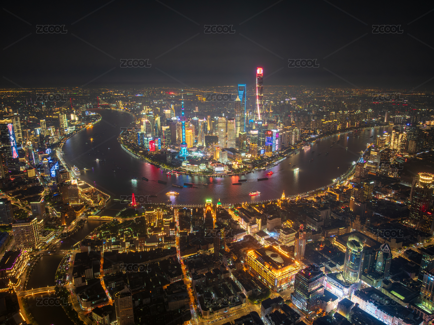 鸟瞰上海陆家嘴黄浦江夜景全景