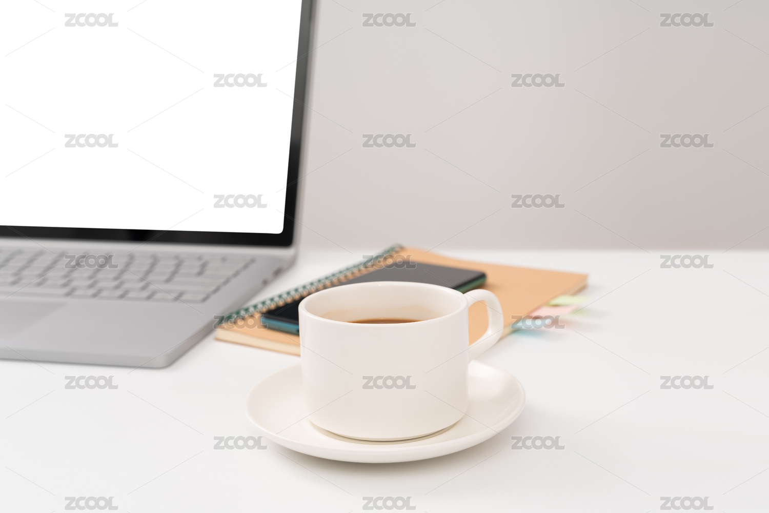 办公桌面上的电脑与咖啡杯,休闲办公概念
