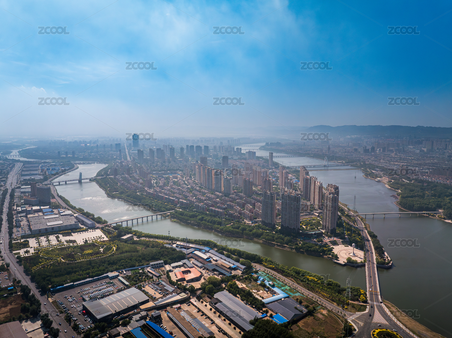 河南省宜阳县洛河湿地城市天际线航拍
