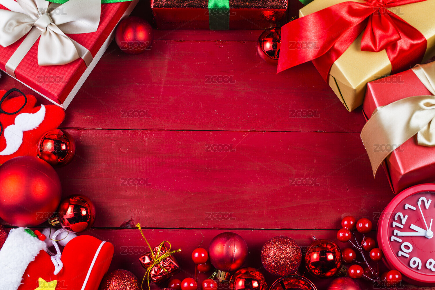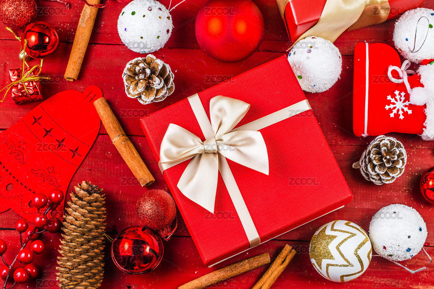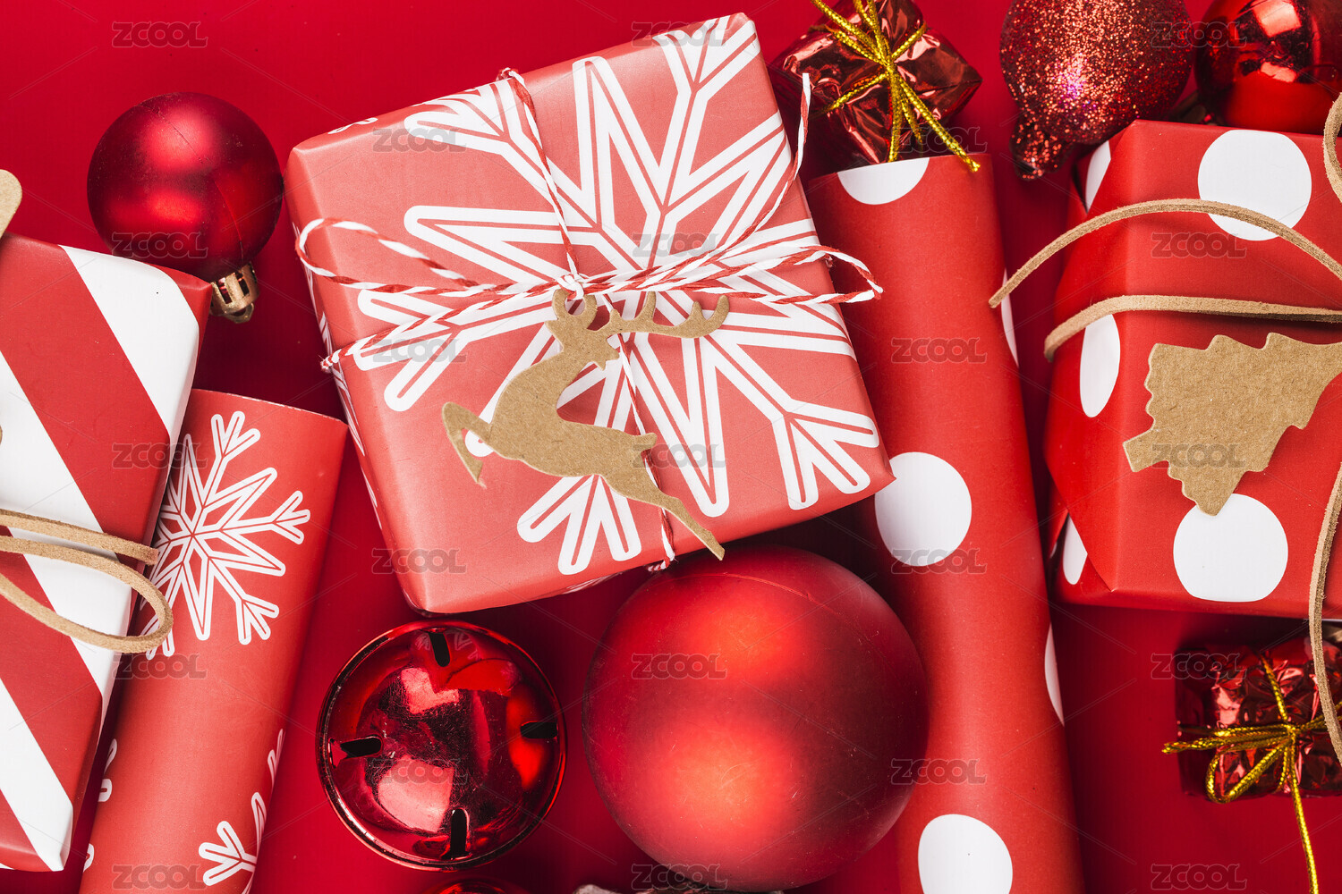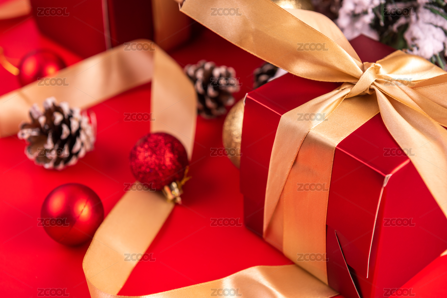 红色背景上礼盒和装饰彩球