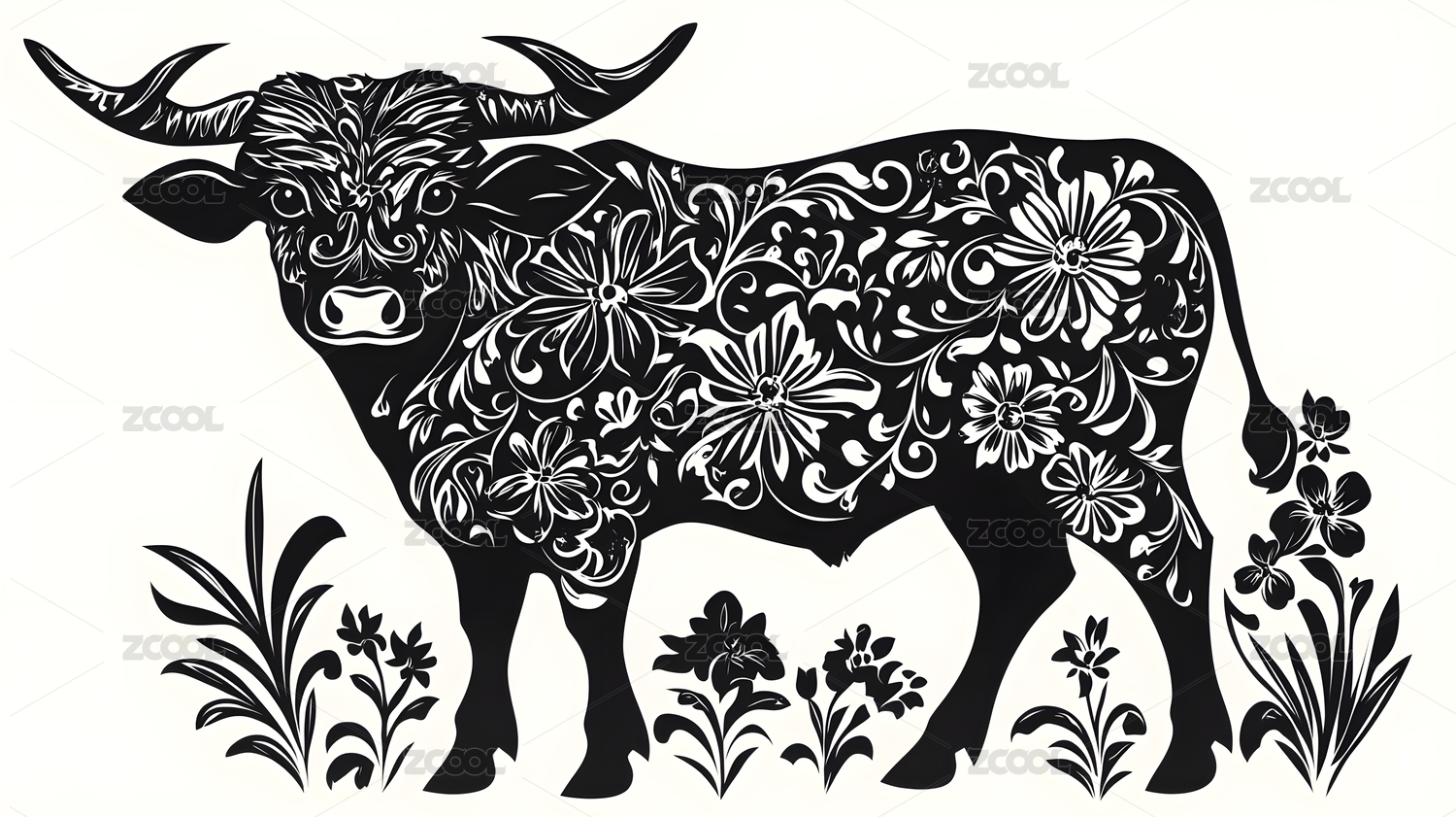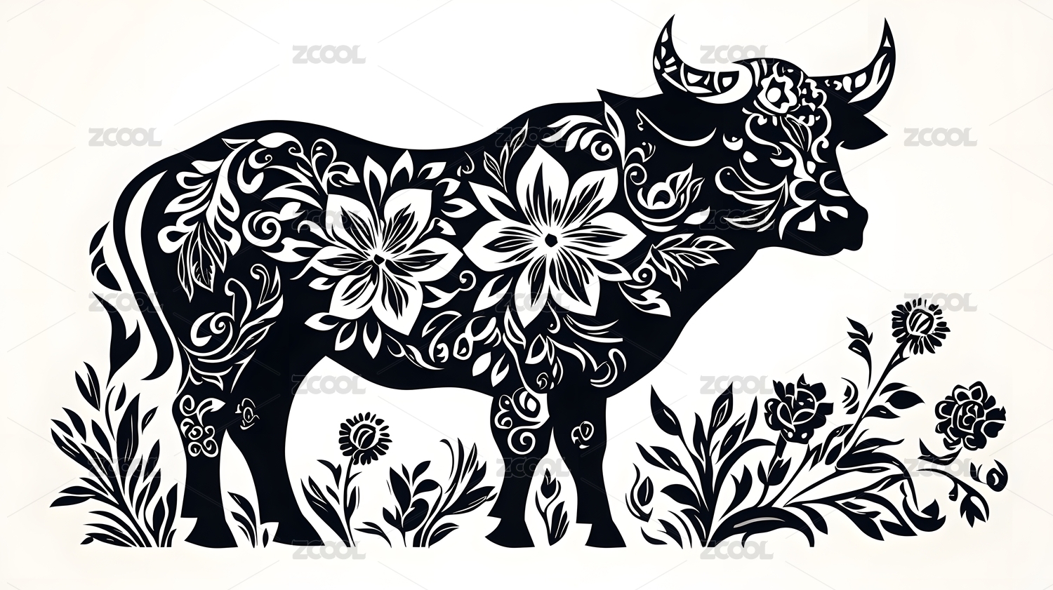 生肖牛黑白剪纸画