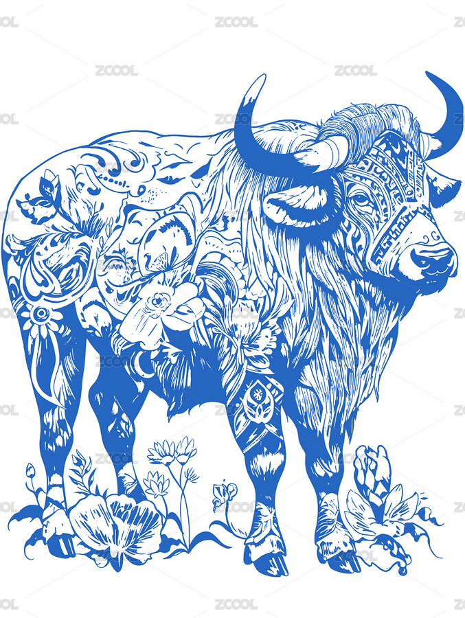十二生肖牛的蓝红风格精美版画