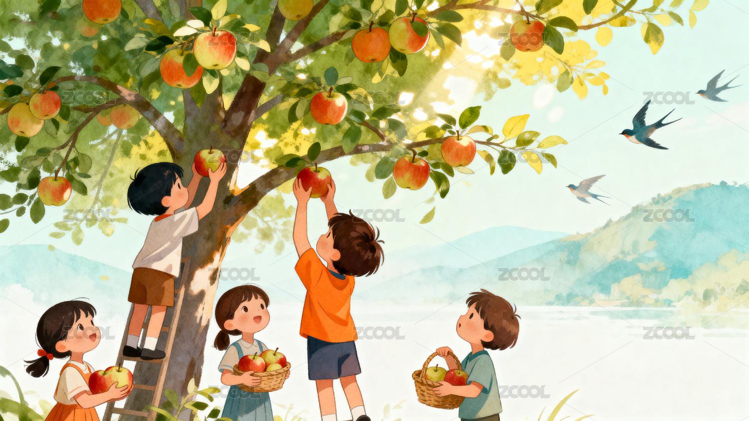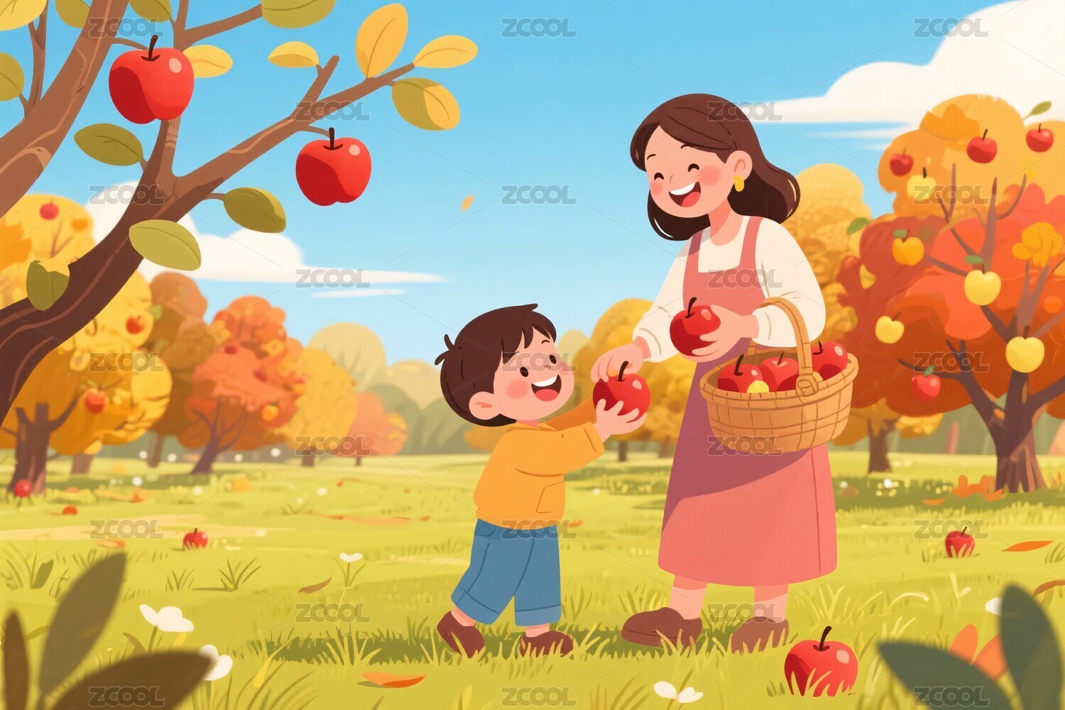 秋天,果园,苹果,苹果树,卡通,插画,丰收,开心,采摘,妈妈