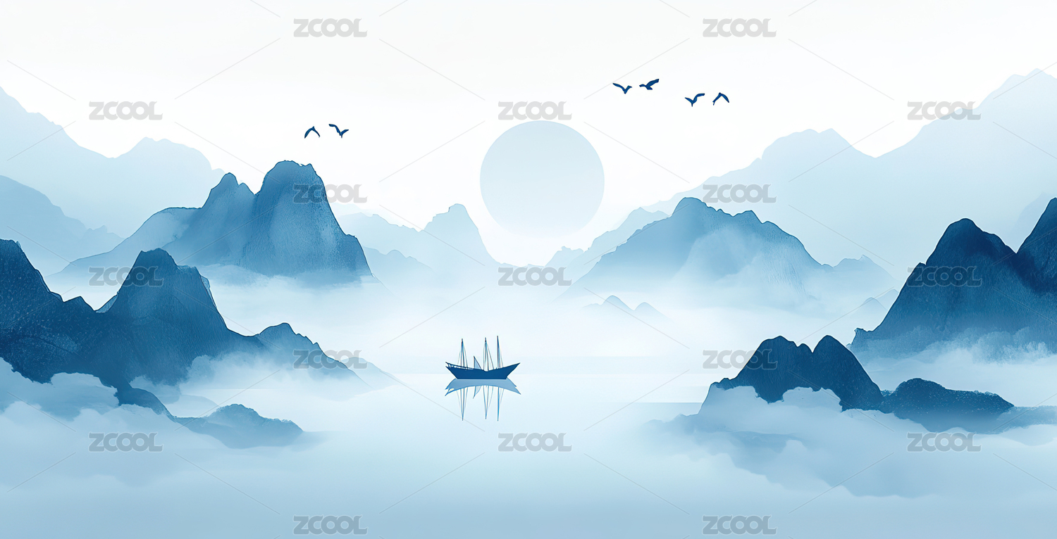 新中式蓝色意境山水画中国风水墨山水背景