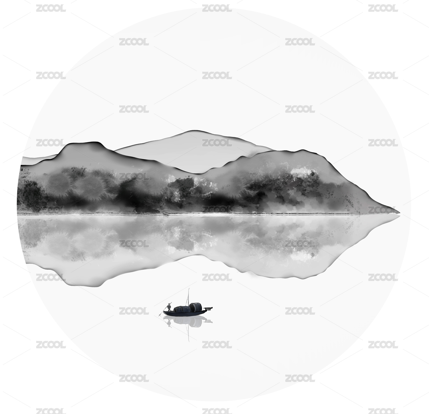 圆形水墨意境山水画