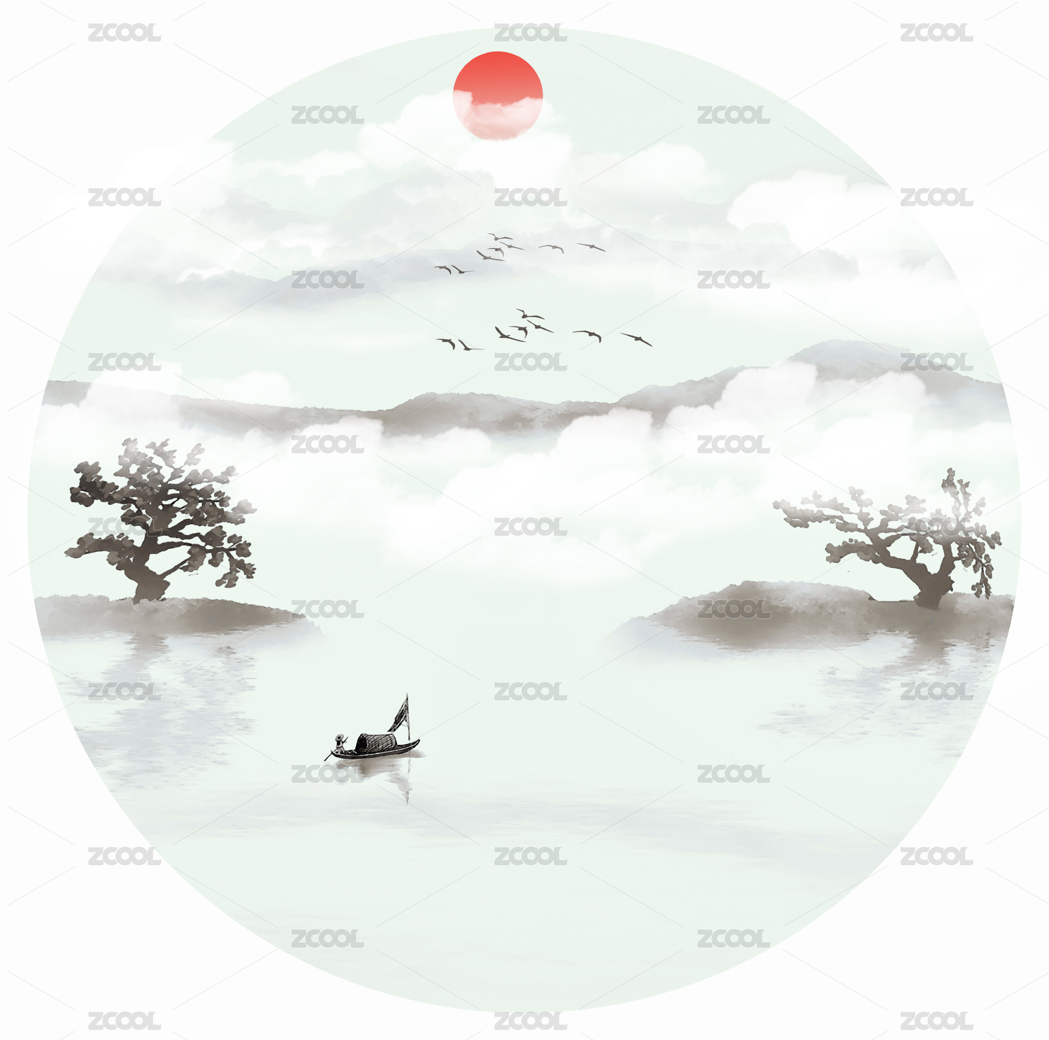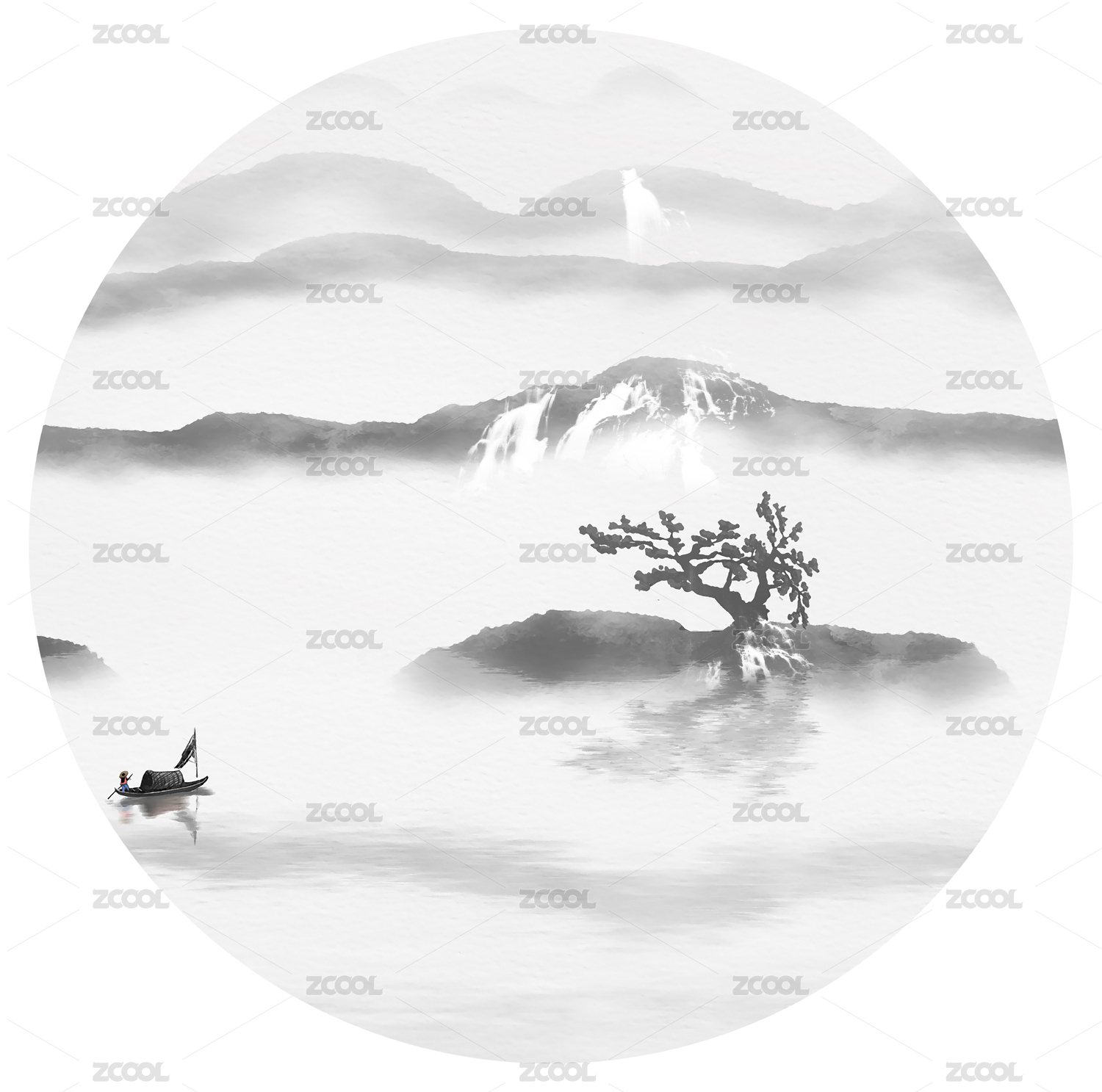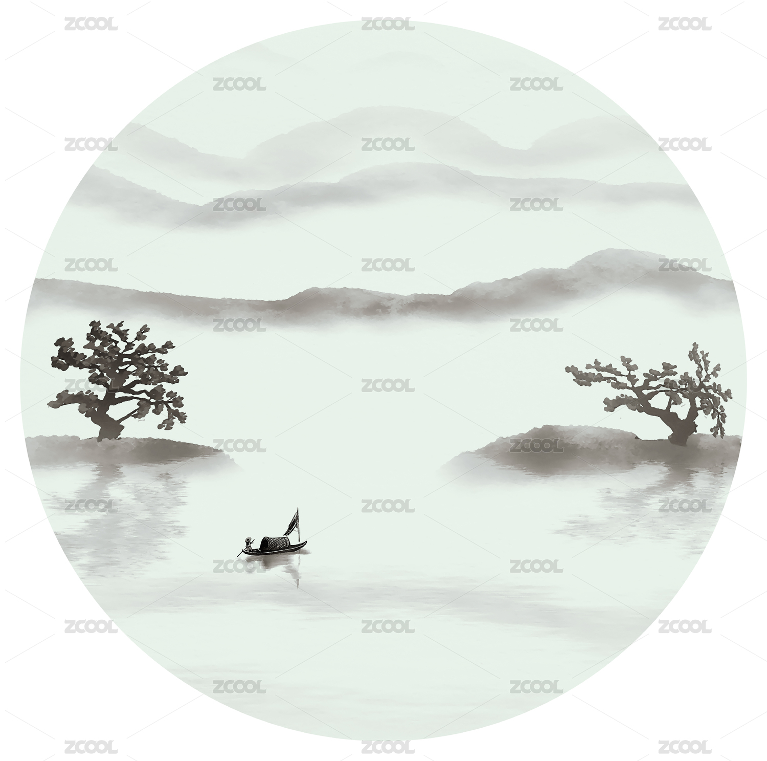 圆形意境水墨山水画