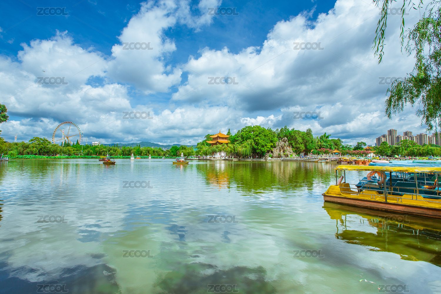 中国云南省昆明市大观公园,湖里漂荡着游船
