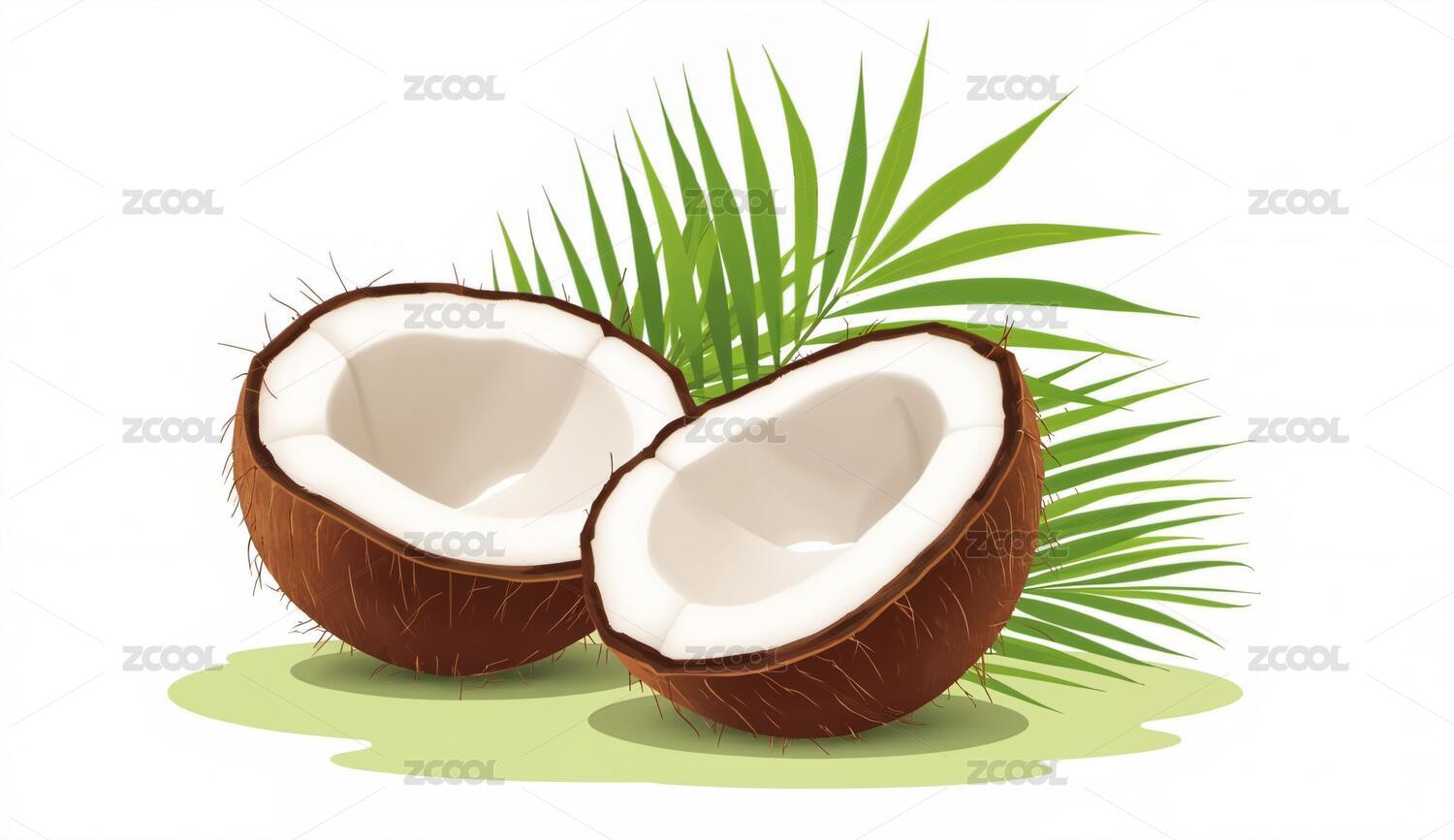 切开的椰子与绿叶