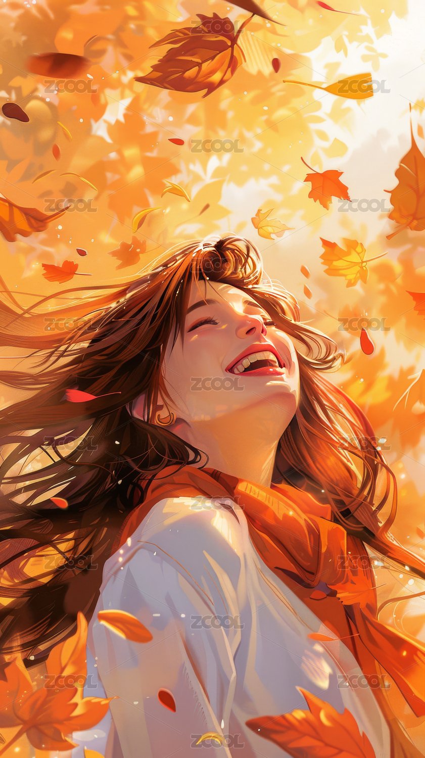 AIGC202402,人物,插画,女孩,秋天,落叶,写意
