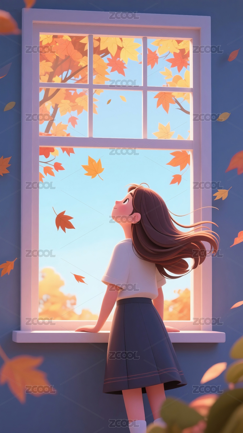 秋天在窗户边看枫叶的女孩