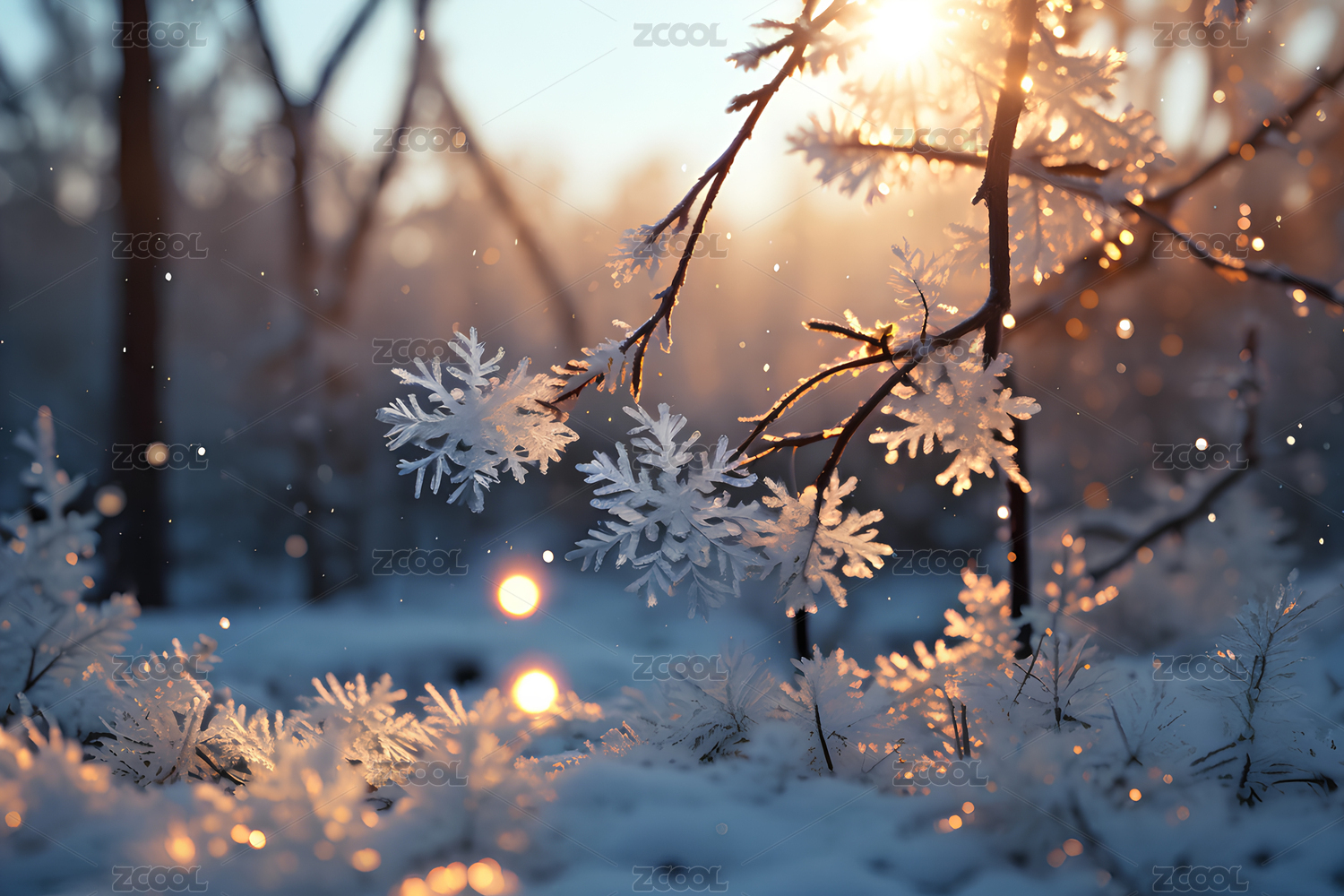 夕阳下晶莹剔透的雪花