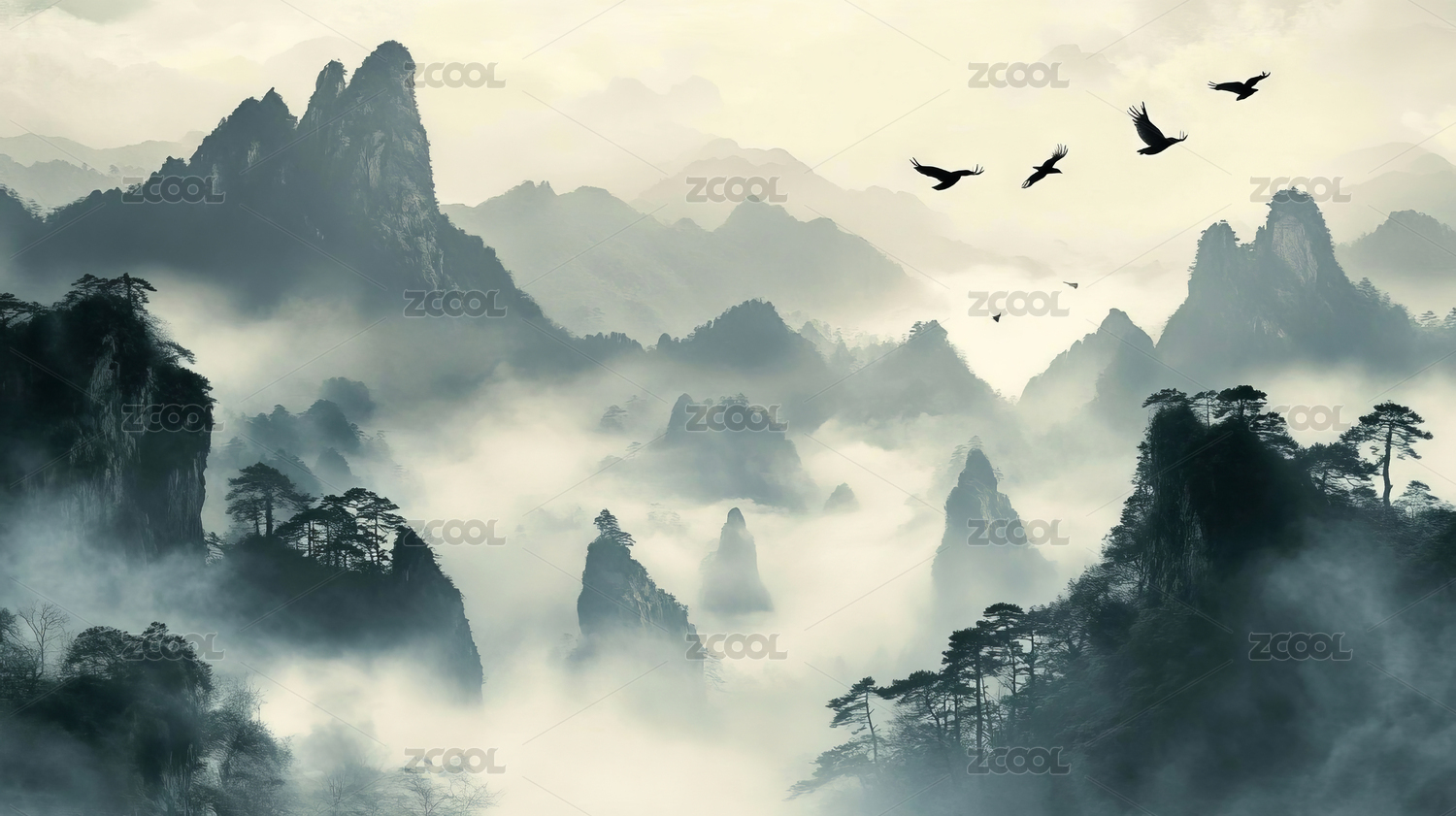 中国风仙鹤云雾山峦意境图