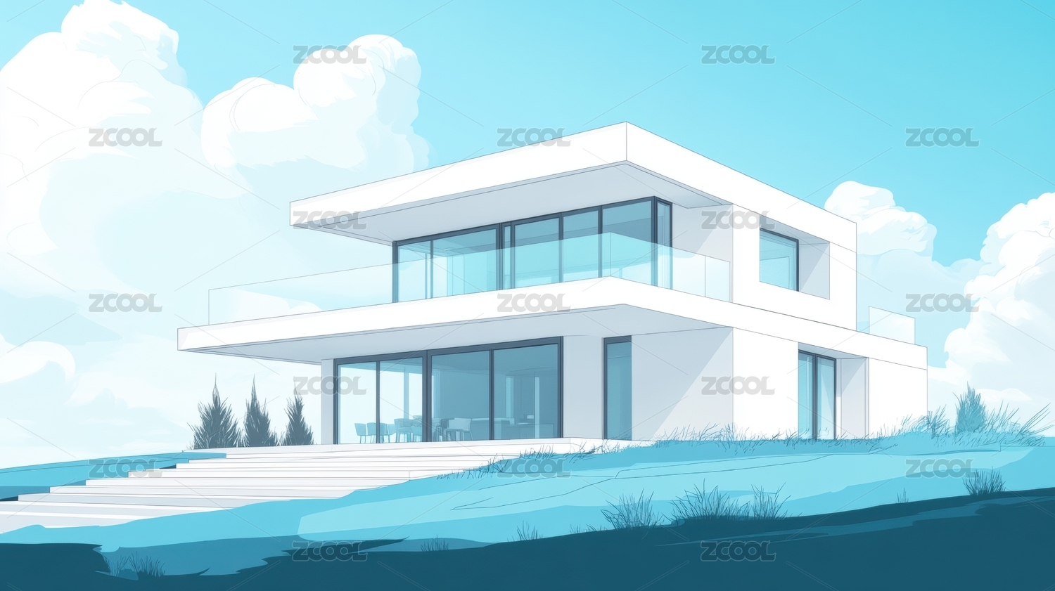 3D极简现代感豪华超大别墅场景效果图