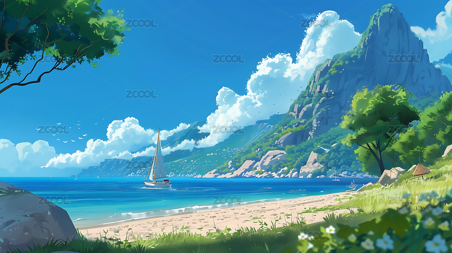 夏日清凉沙滩插画壁纸