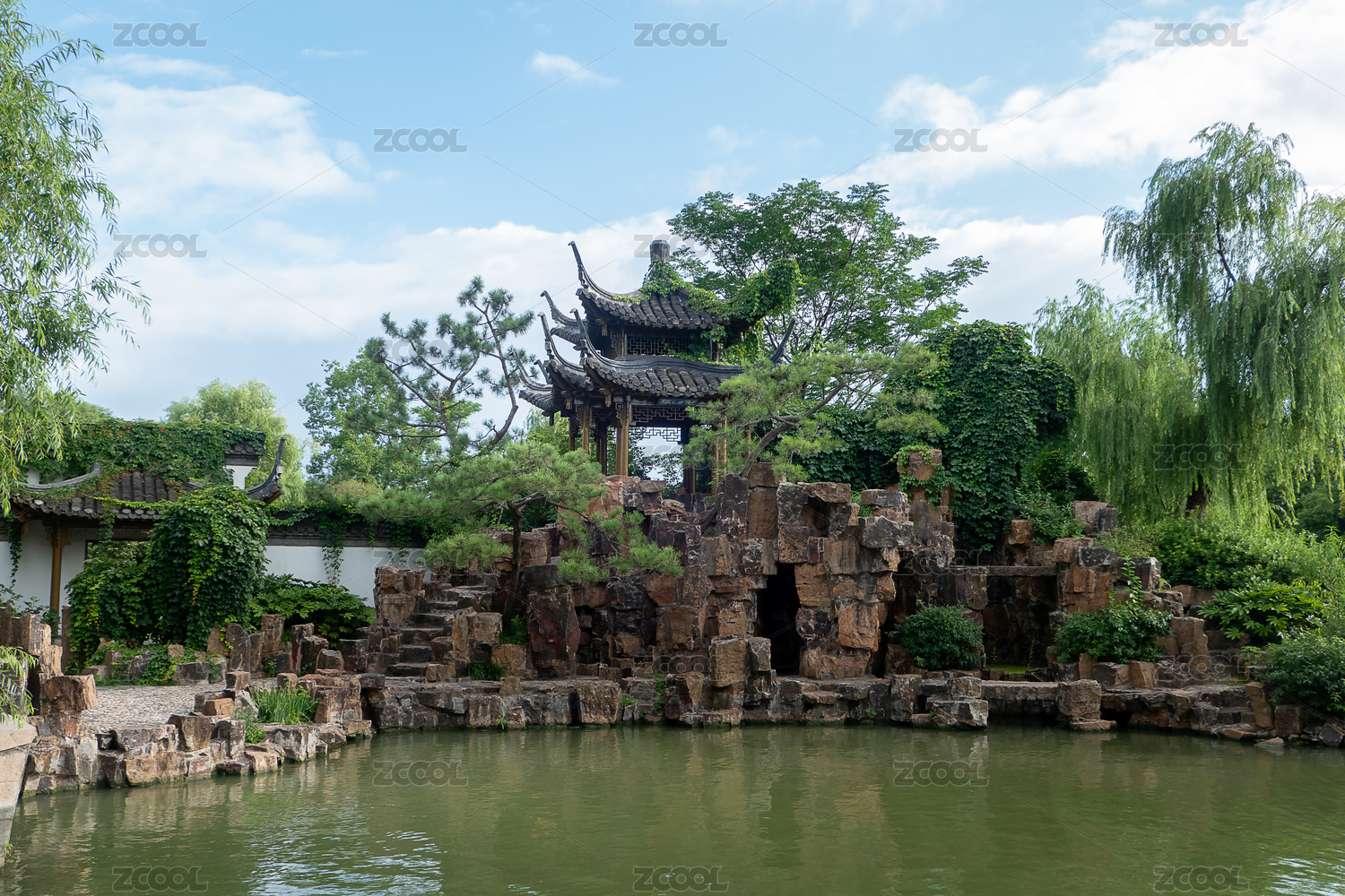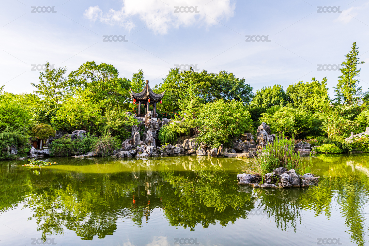中国古典园林中的假山凉亭和池塘