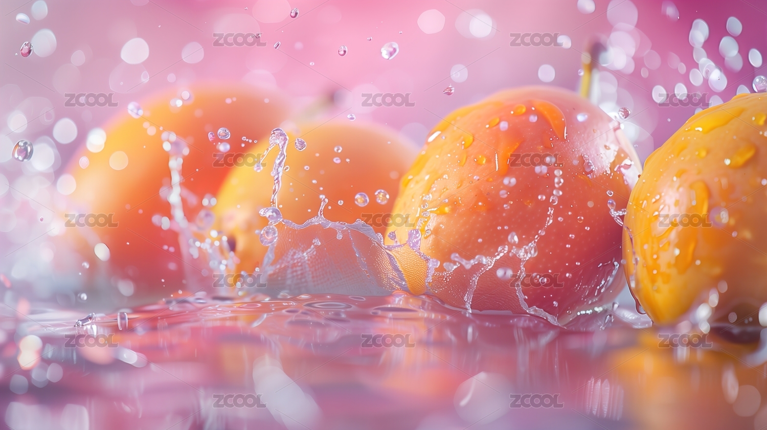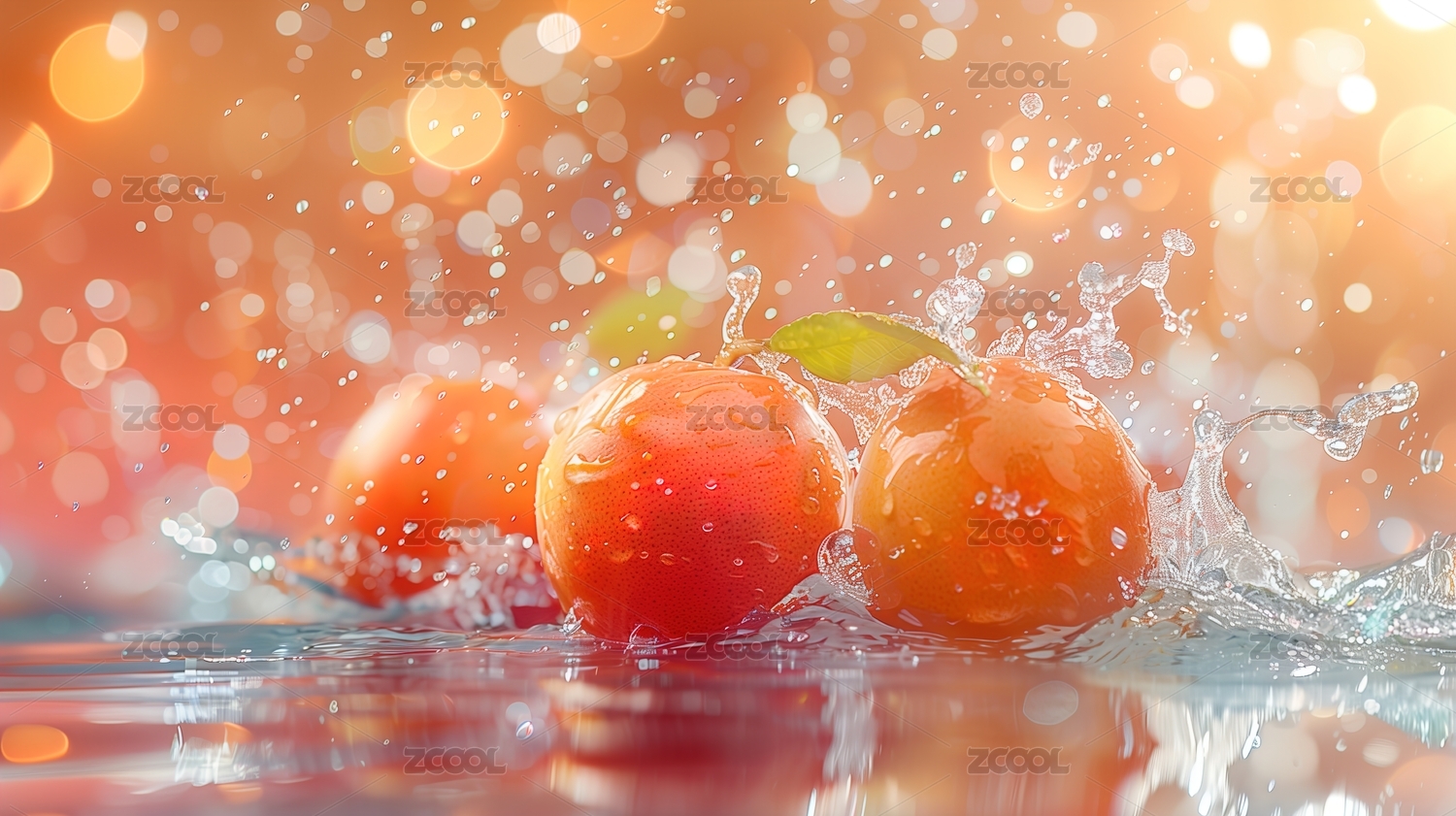 黑底入水瞬间的桃子飞溅起水花3D插画