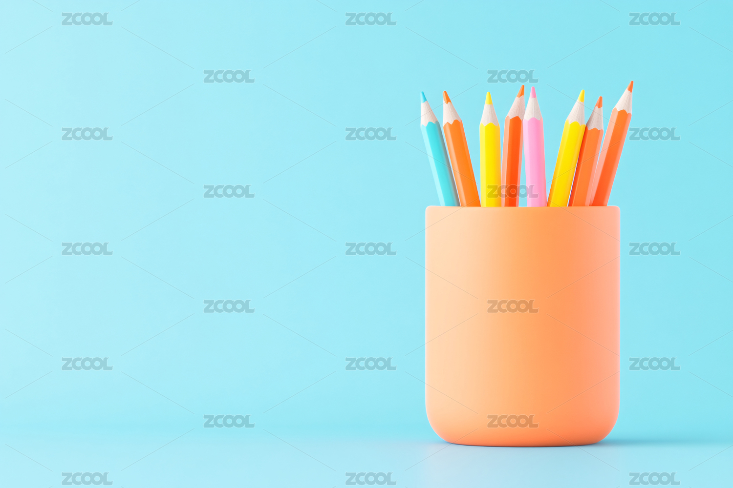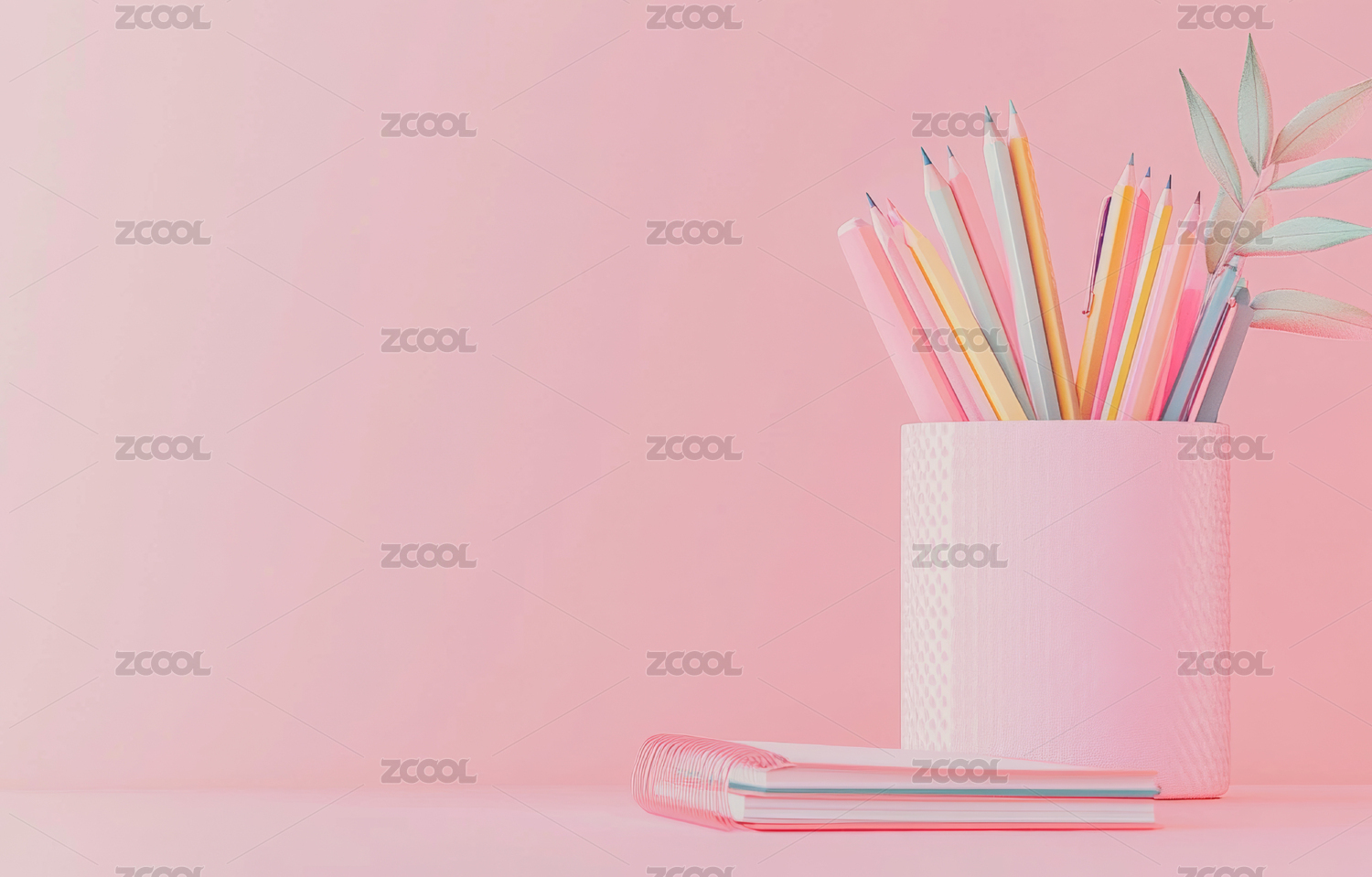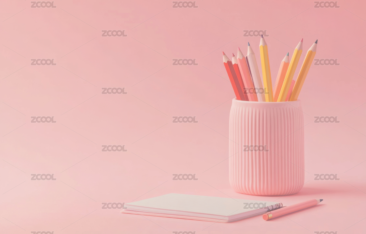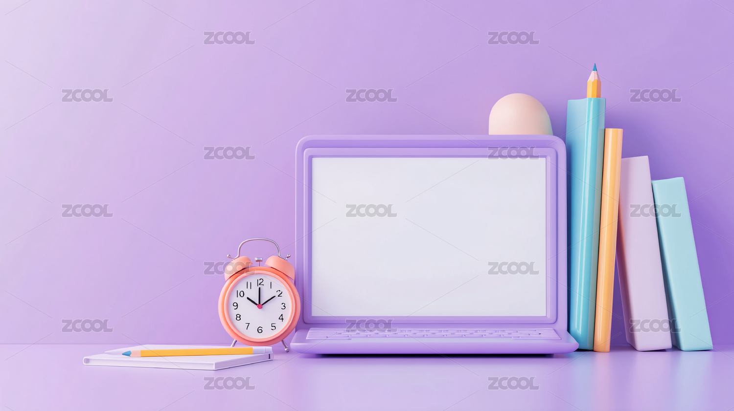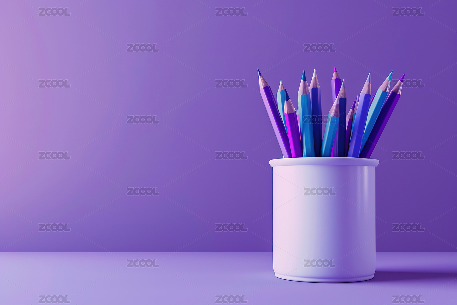 闹钟,文具,粉色,剪刀,彩色铅笔,橙色笔筒,紫色背景,整洁,学习,办公
