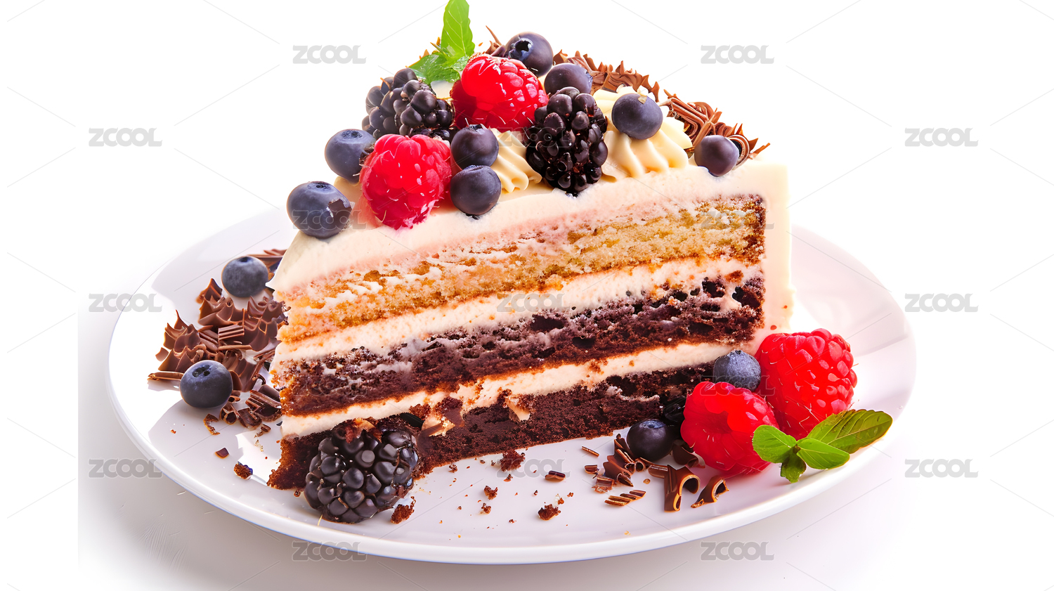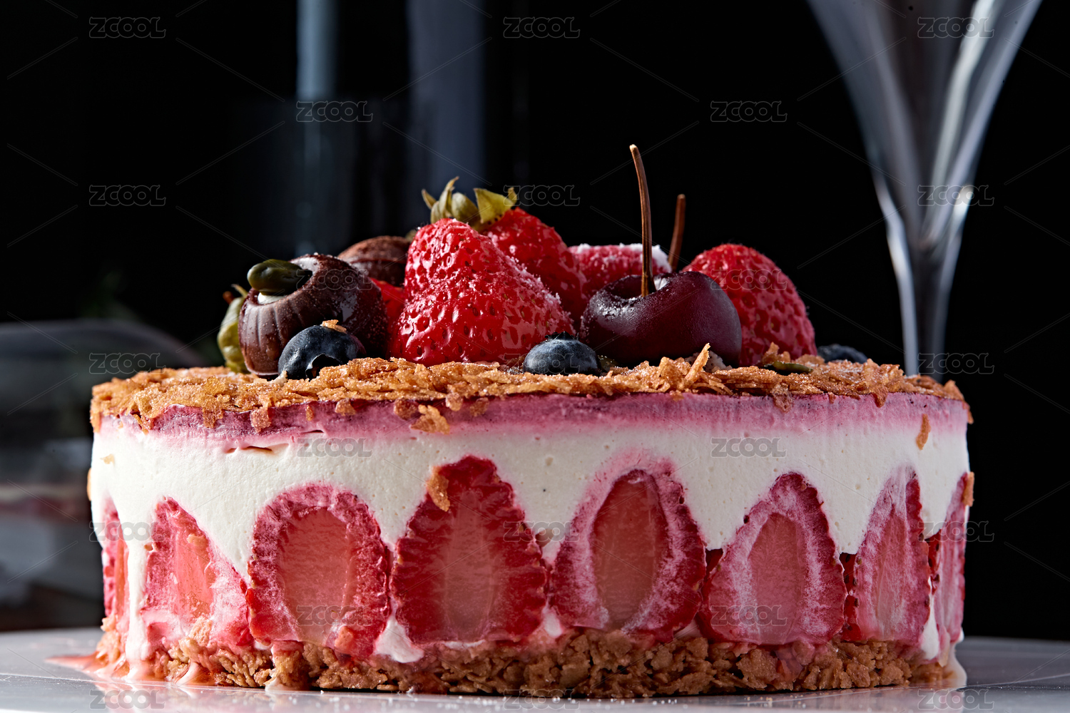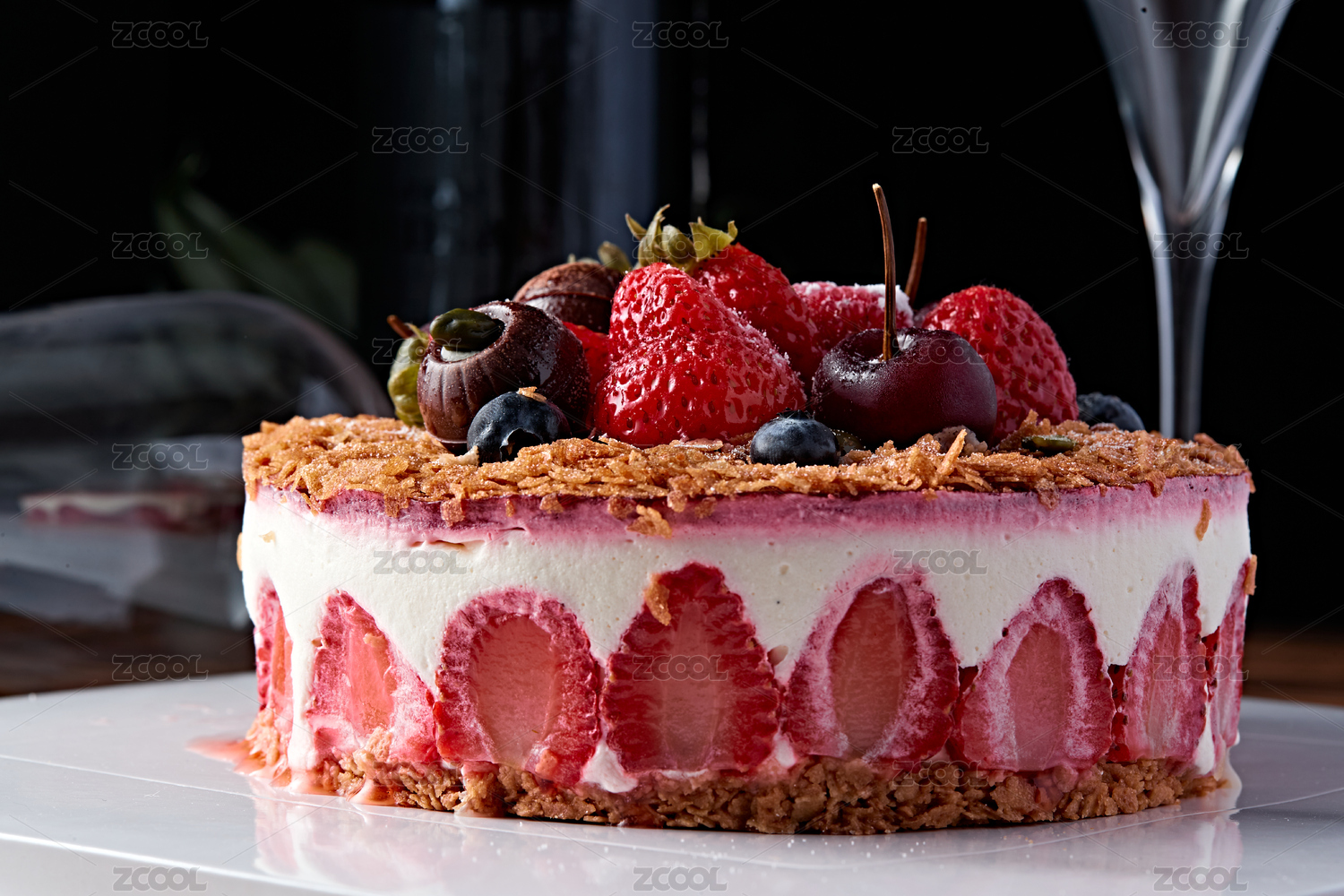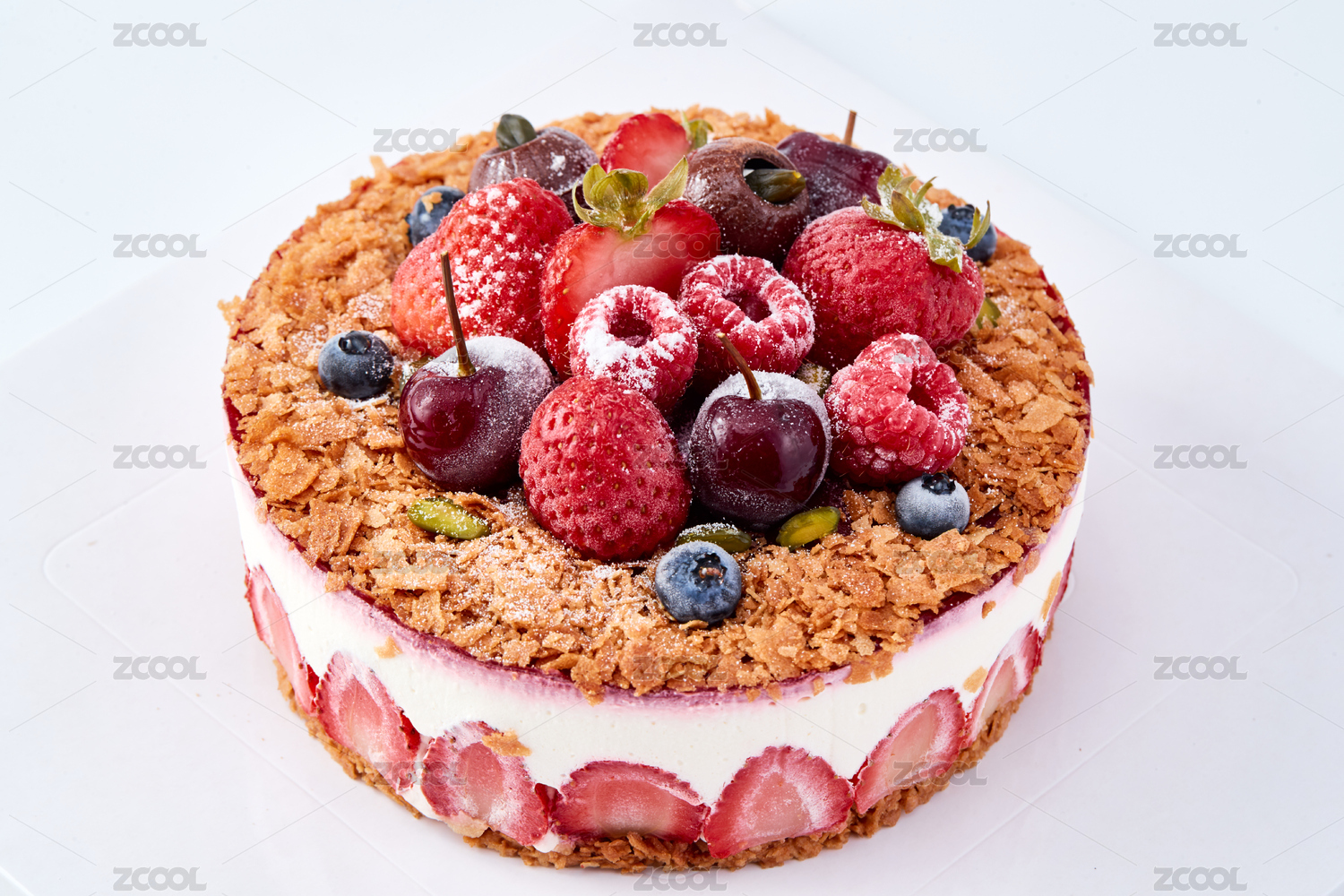 鲜水果点缀的鲜奶慕斯草莓烤坚果生日蛋糕
