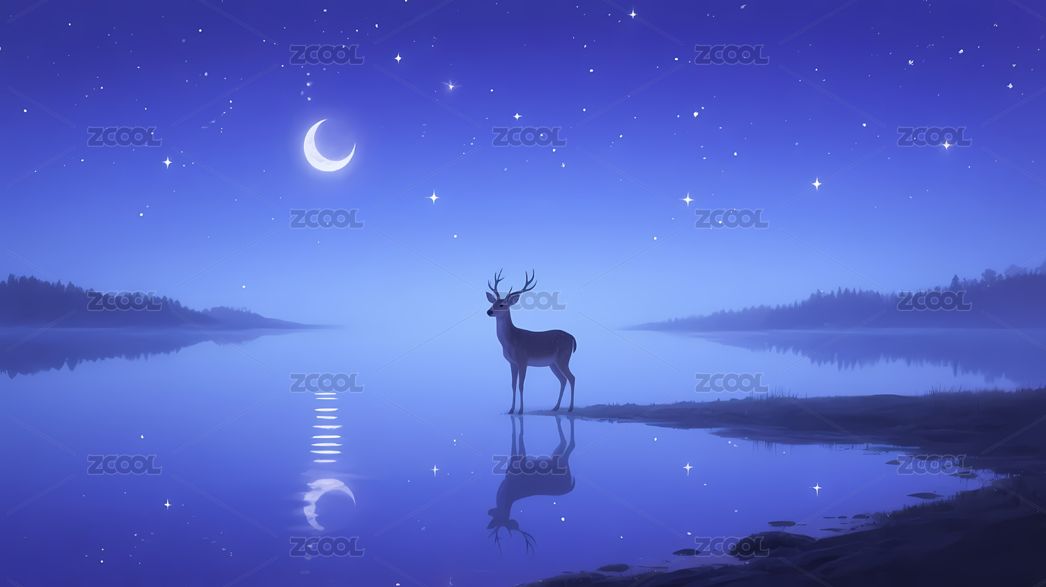 夜空,鹿,满月,星星,树木,山丘,自然,宁静