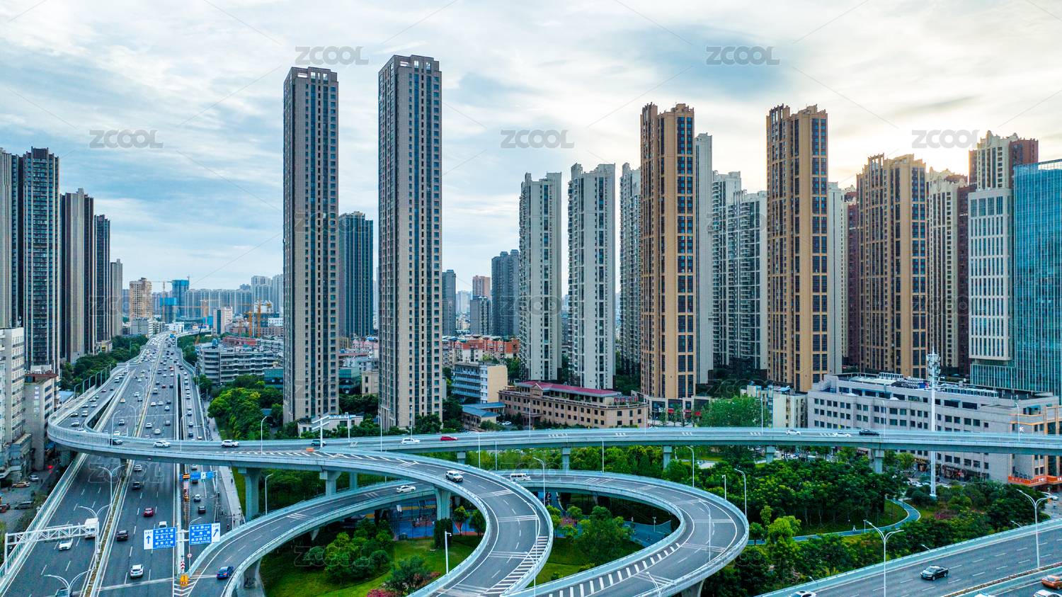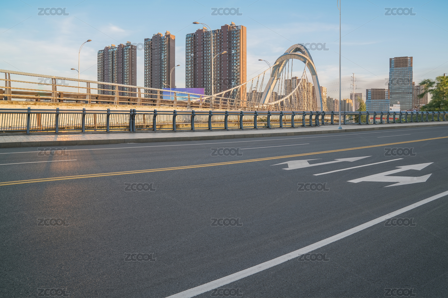 中国武汉空旷的柏油路与现代城市建筑天际线全景