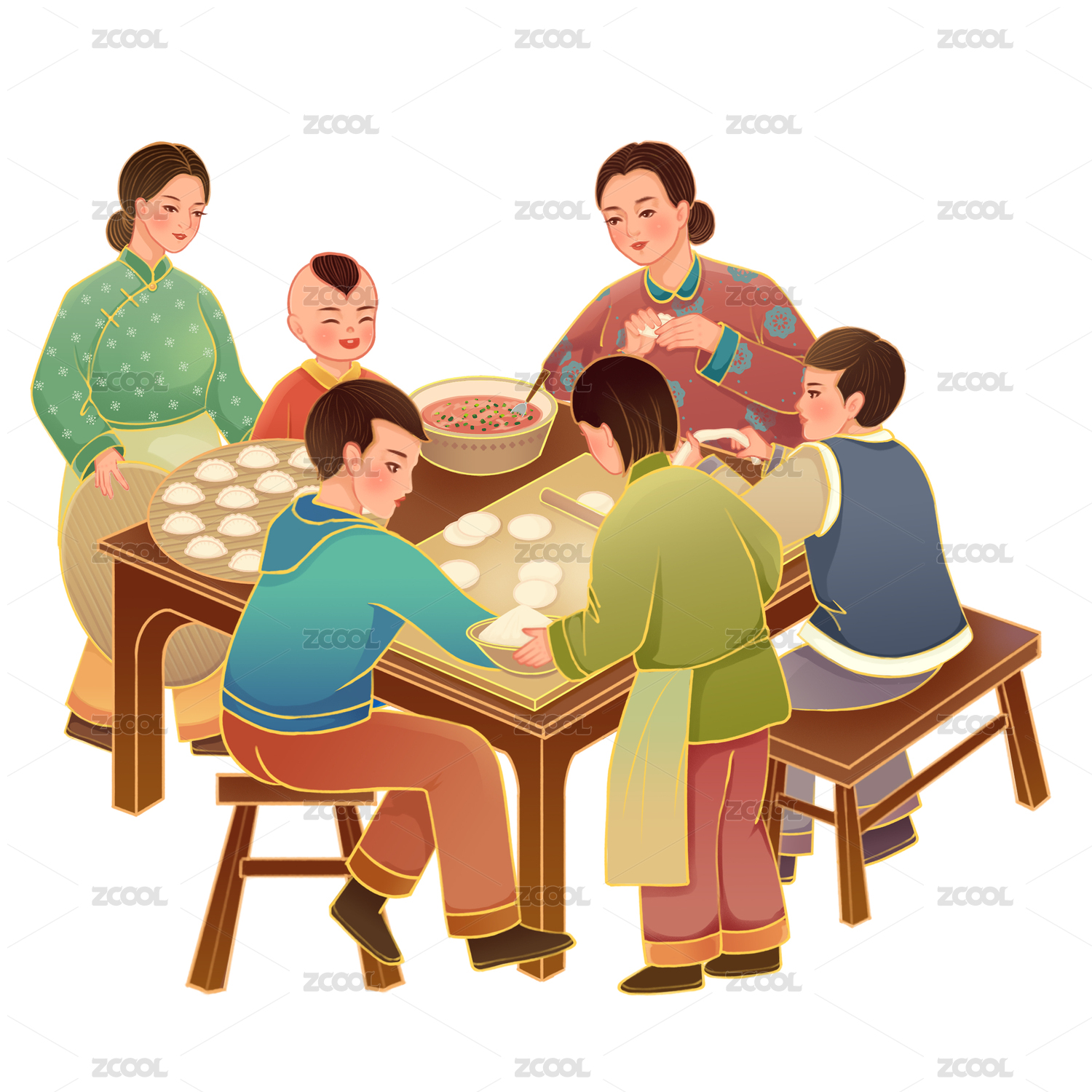 春节一家人包饺子