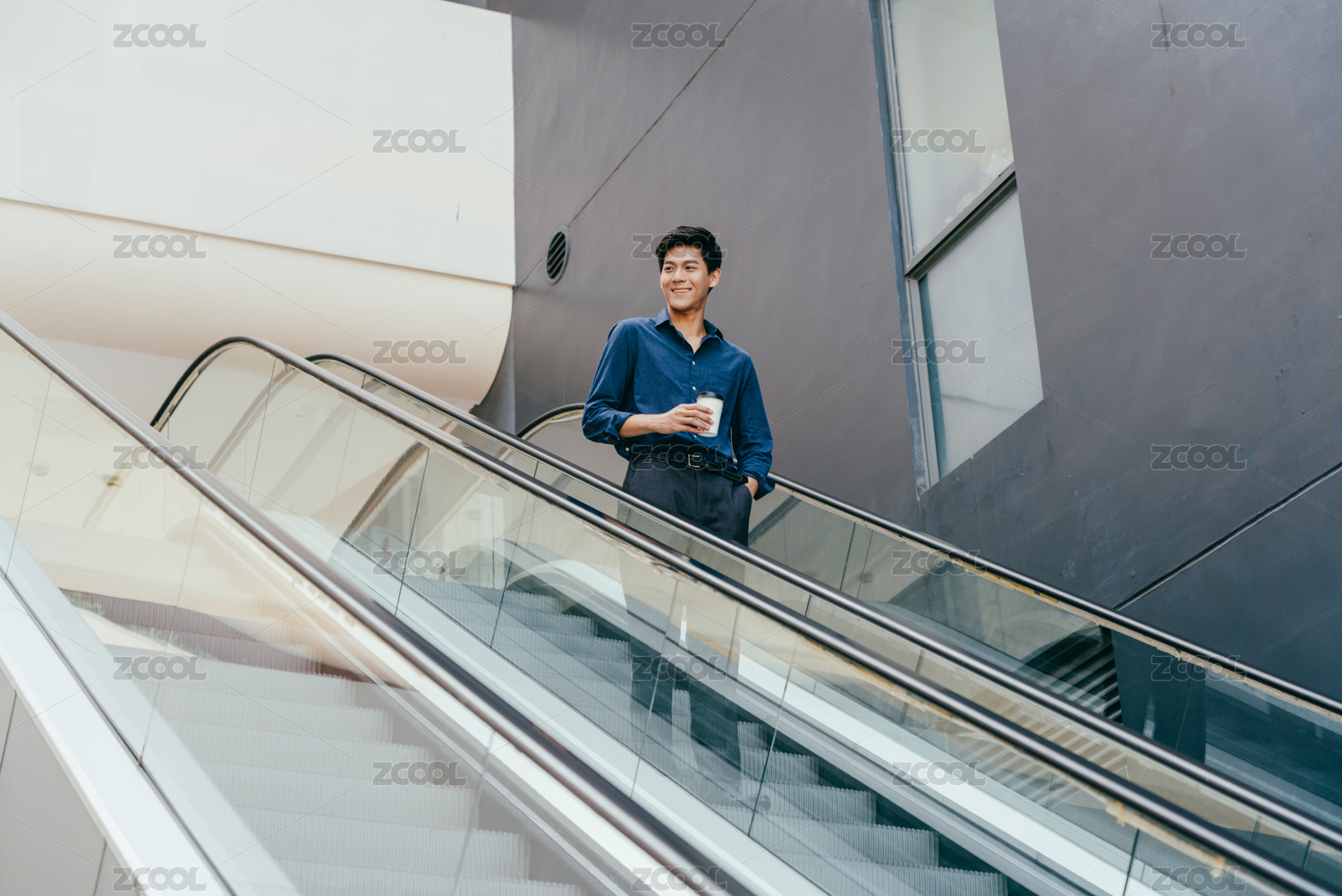 手拿着咖啡杯在手扶梯上的商务男士