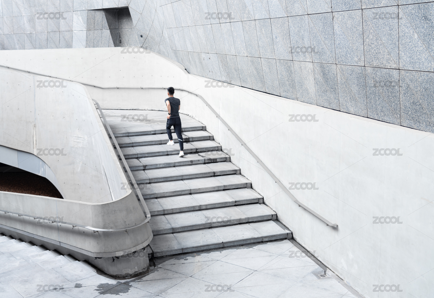 一名年轻的中国男性在城市的建筑旁边跑步