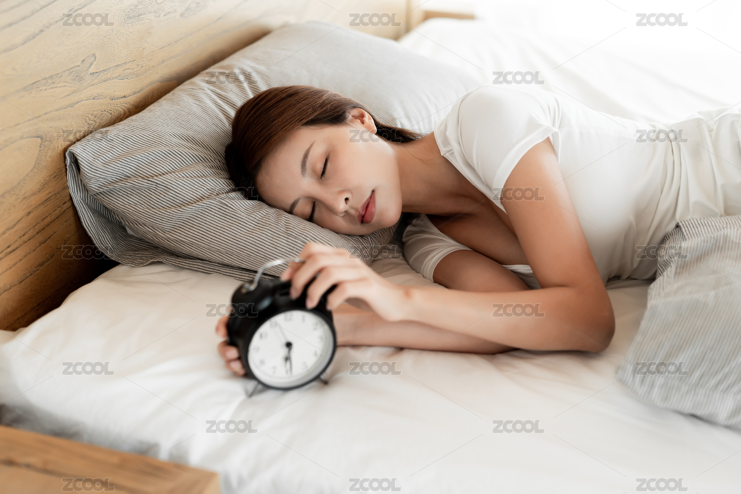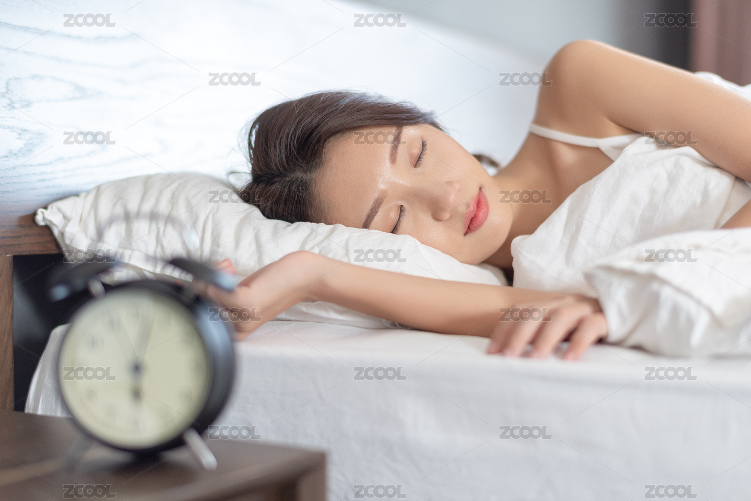 居家室内卧室床头的闹钟和入睡侧卧的女性