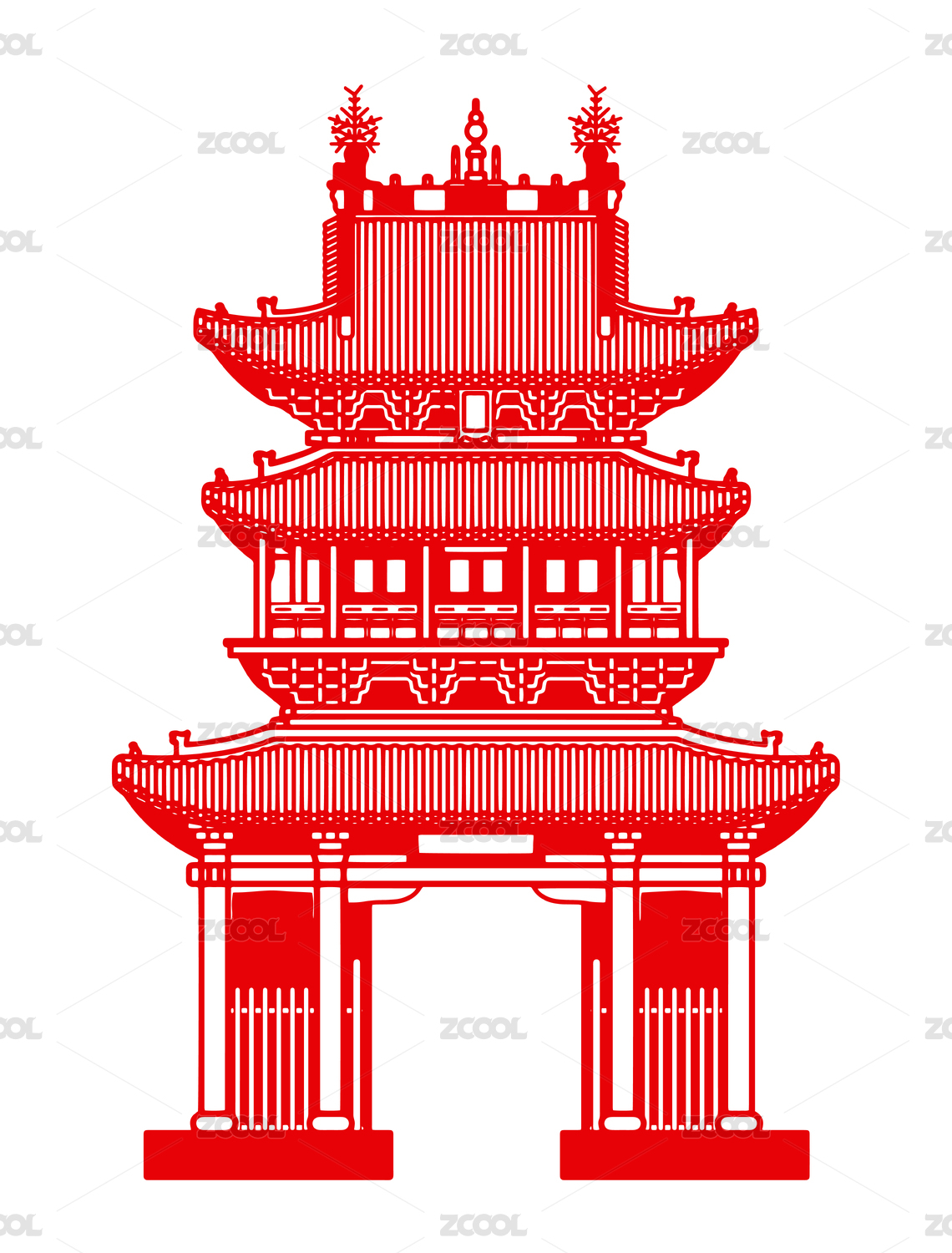 红色剪纸平遥古城市楼古建筑插画