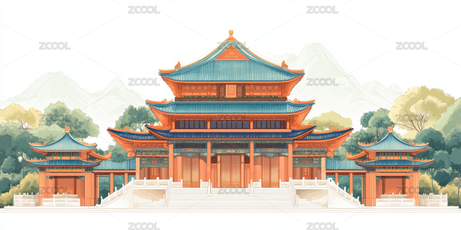 建筑,中式,场景,房屋,旗帜,手绘,阶梯,宫殿,红色,古代