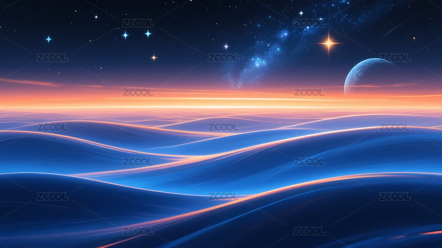 蓝橙渐变波浪映衬星球背景