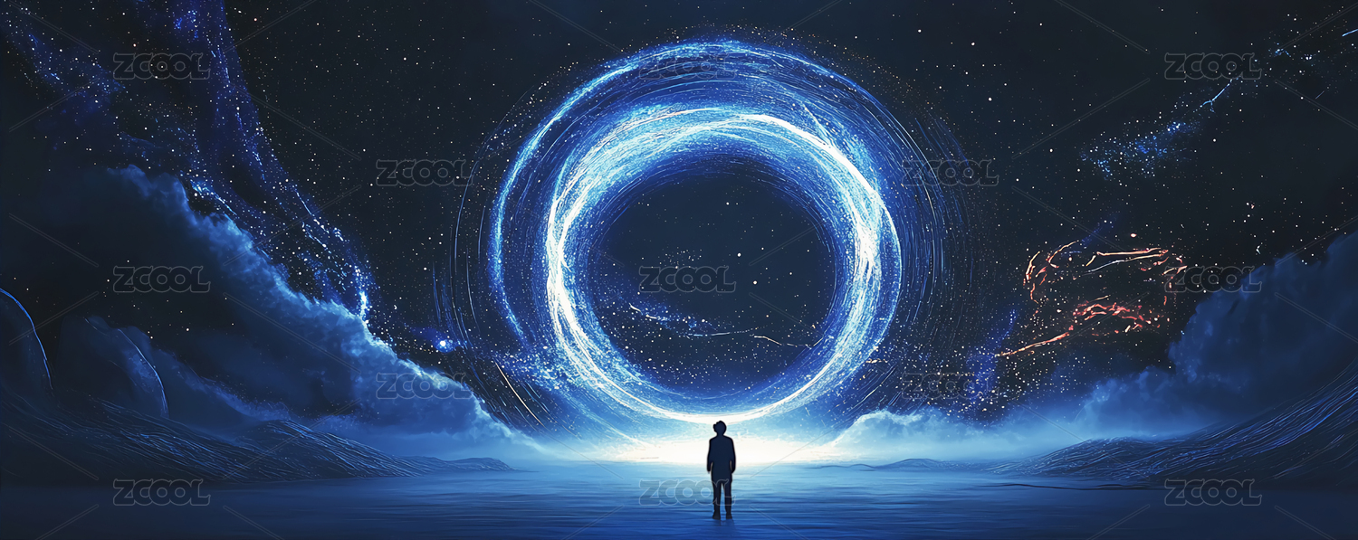 蓝色梦幻天空下孤独身影的超现实主义场景