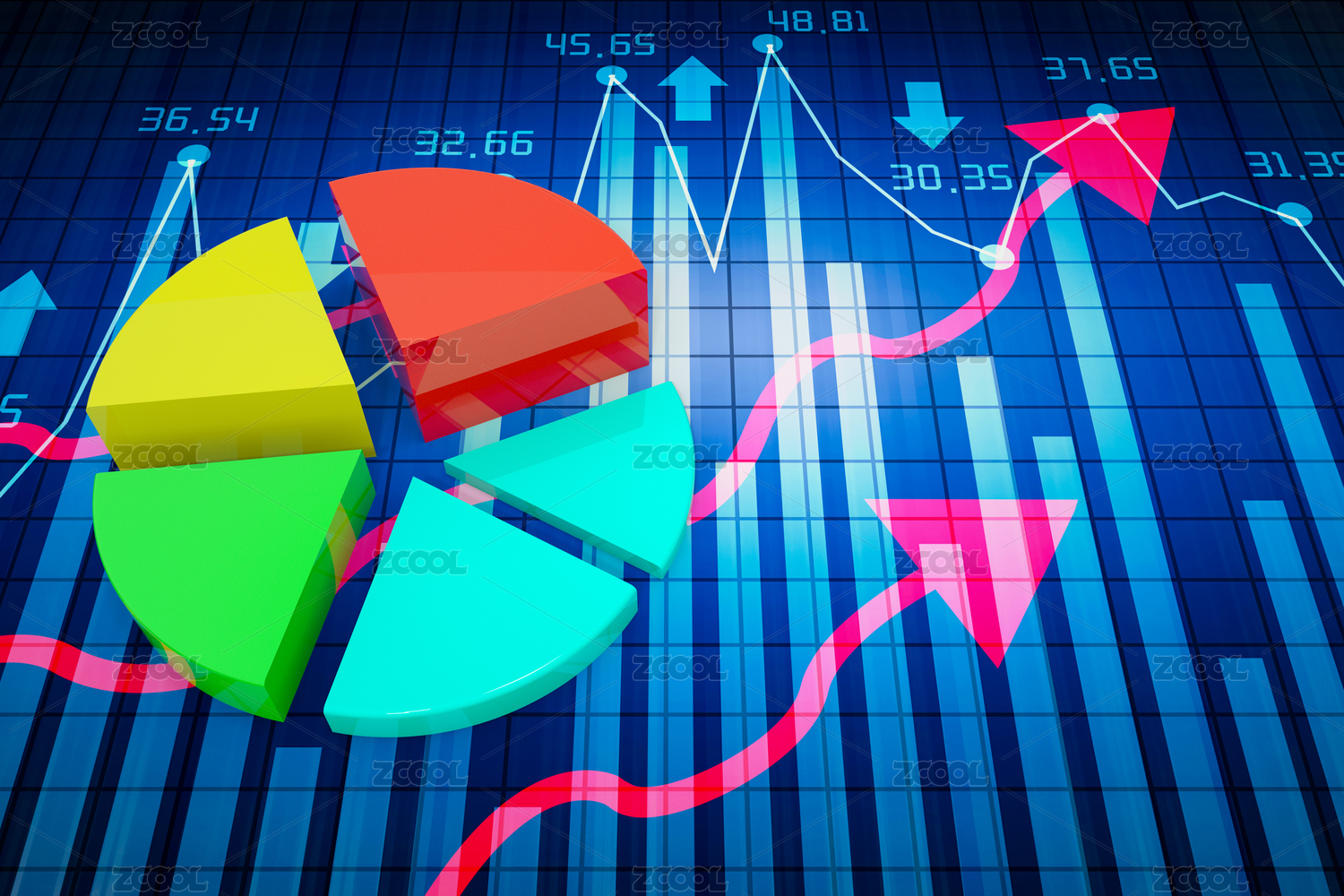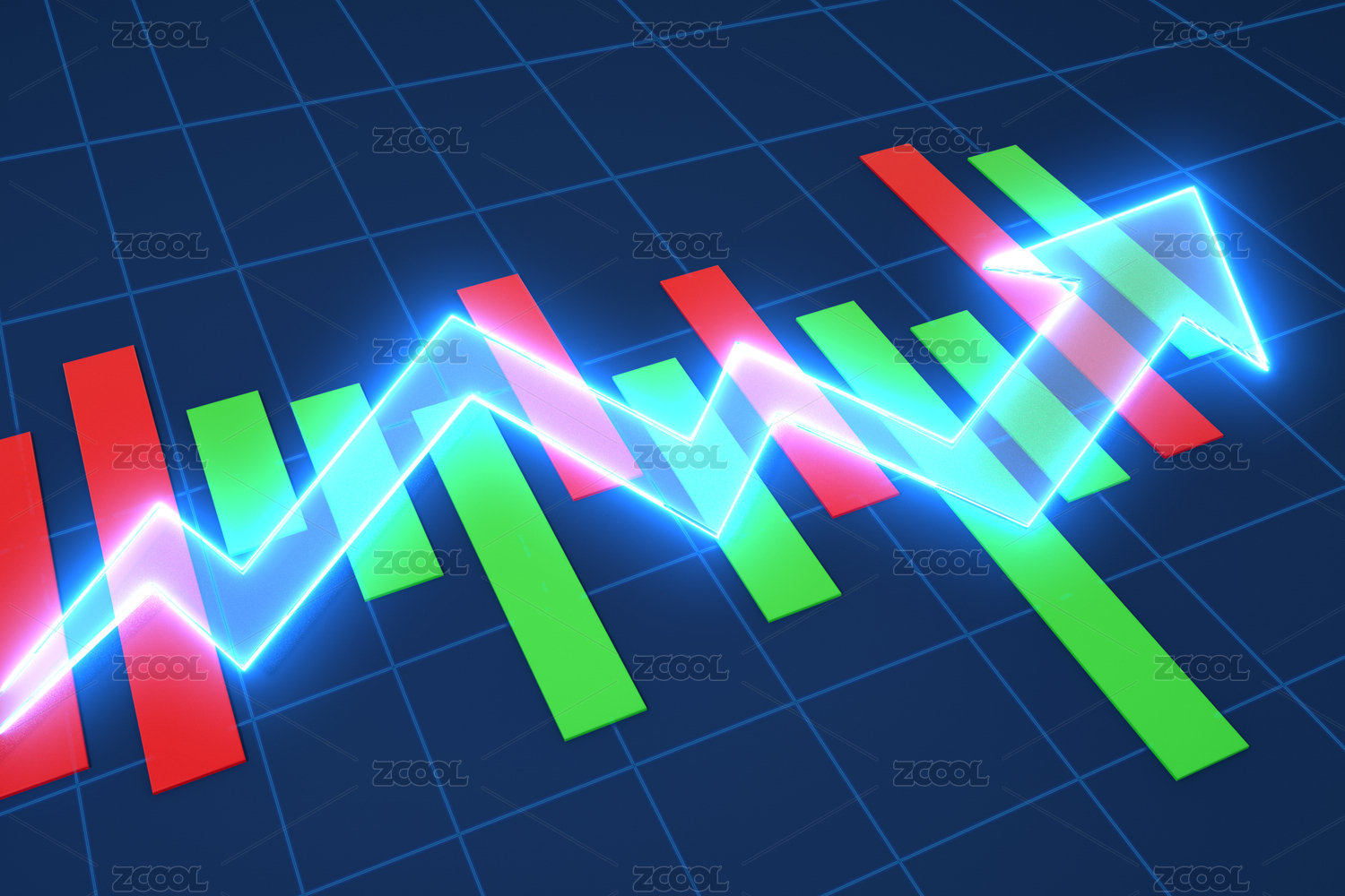 蓝色背景中股市涨跌线和波动箭头组成的金融类插图