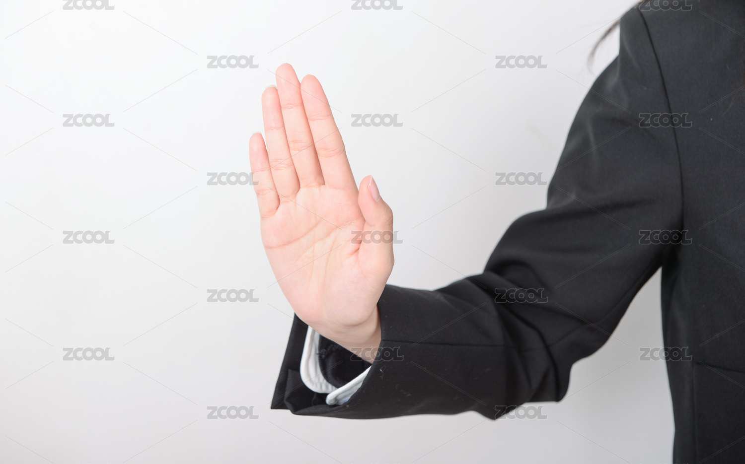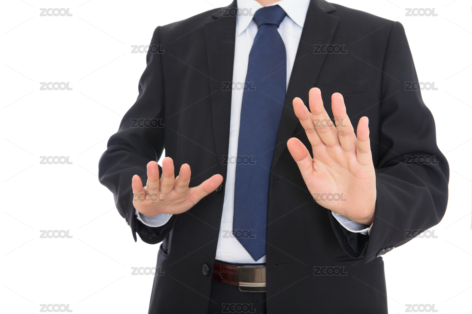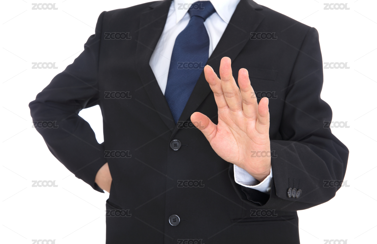 穿着职业西装的男士站在白背景前做拒绝的手势
