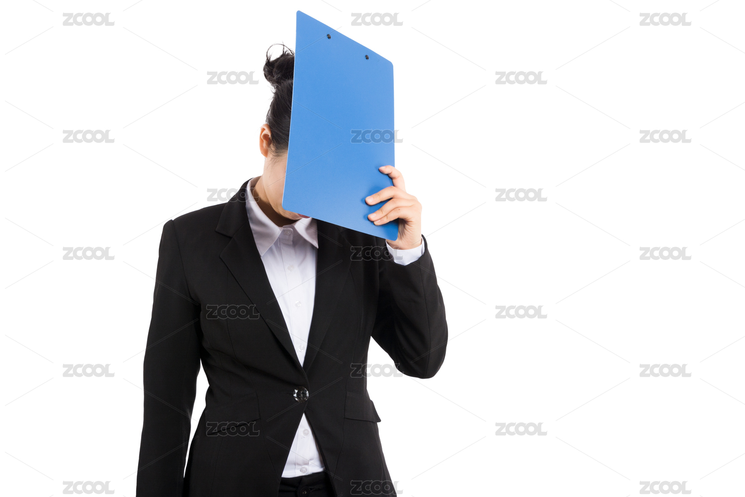 白色背景下拿着蓝色文件夹板的商务职业女性