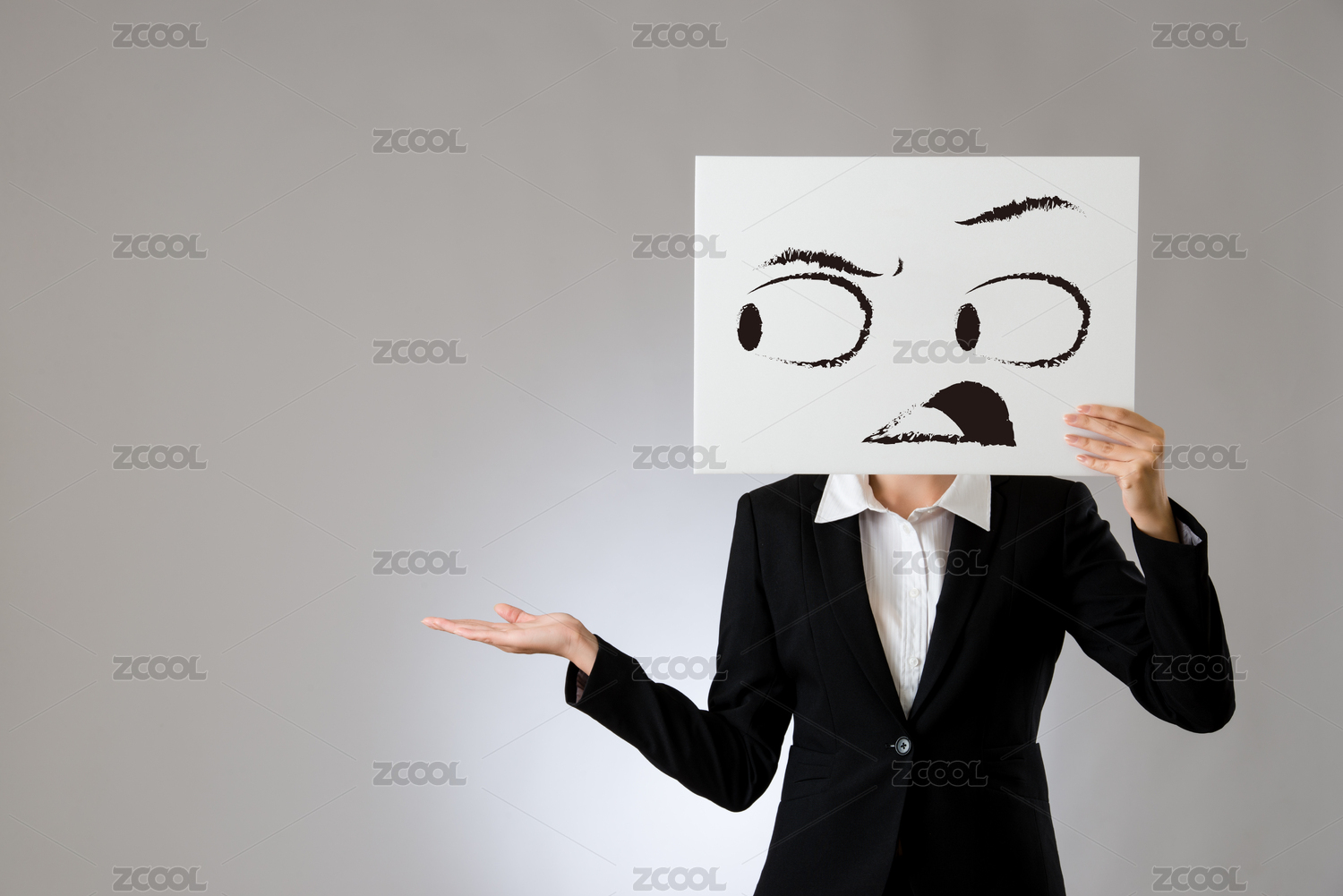 愤怒的老板面子上的广告牌空白持有的女商人画画。隔绝在灰色背景。商务办公企业理念。