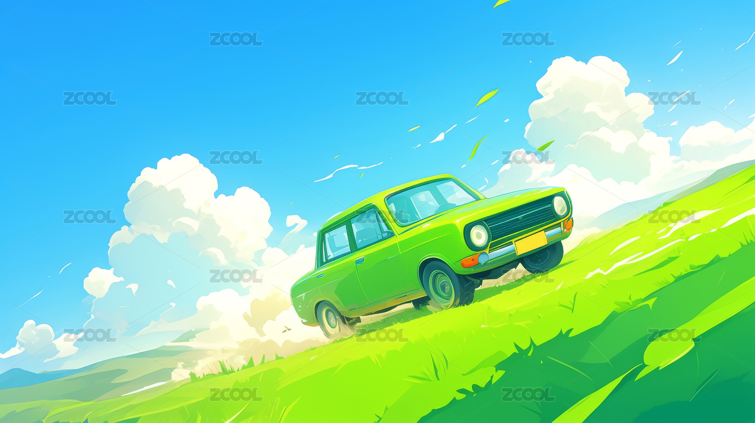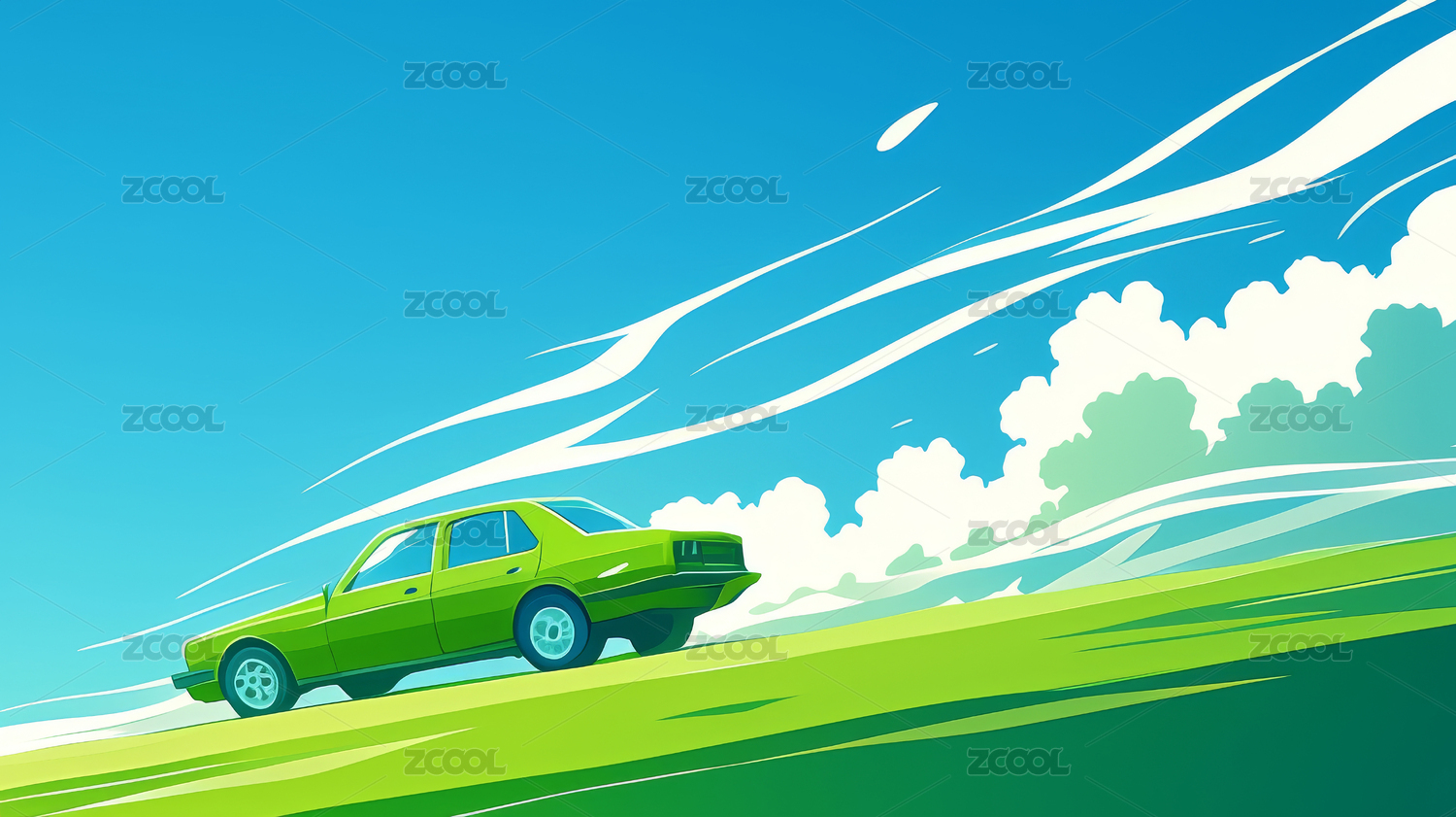 插画,绿色,清新,动感,简约,卡通,速度,旅行,远方,汽车