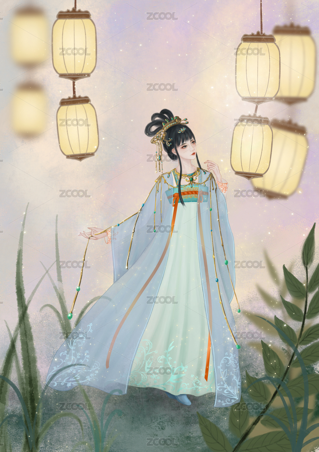 提灯笼的绿衣女子