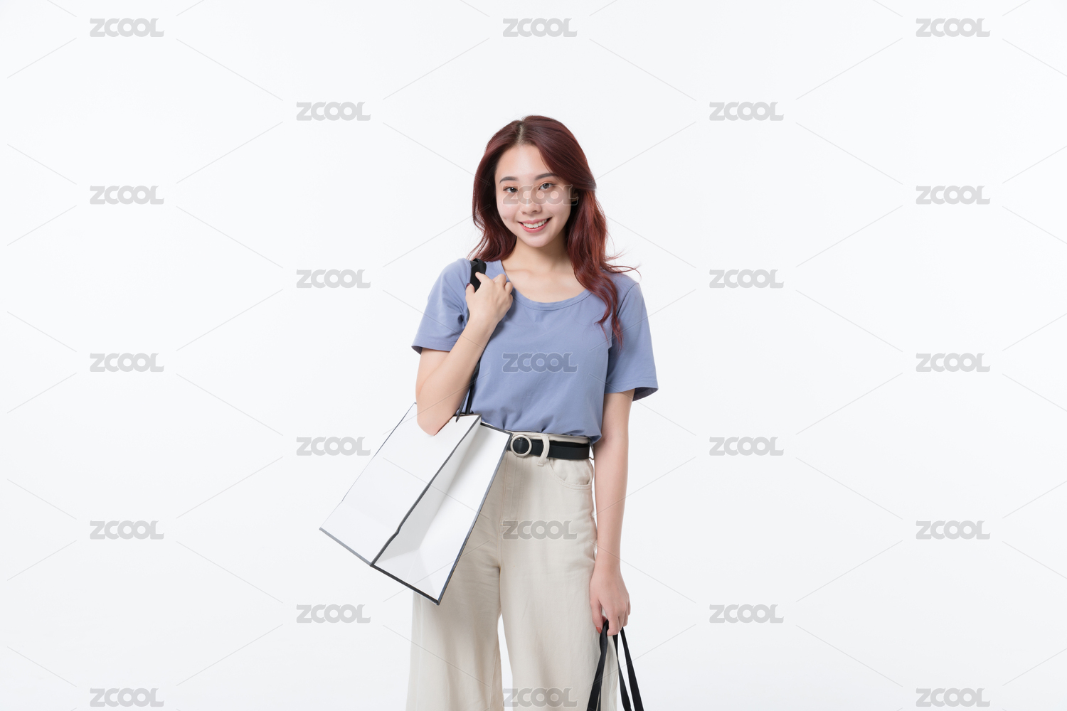 白色背景里,拎着购物袋的时尚亚洲女孩