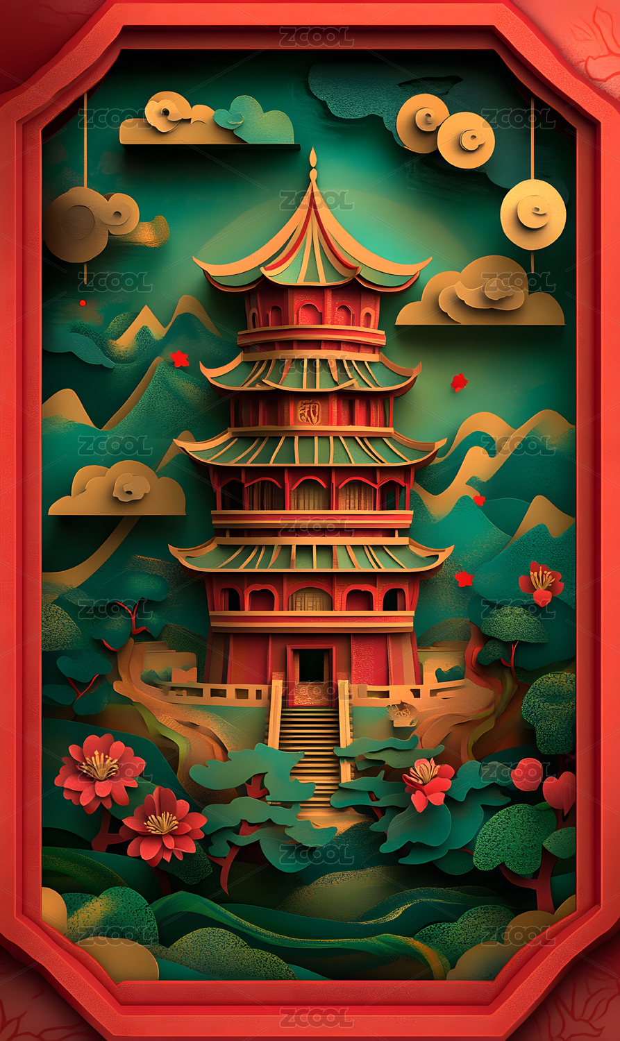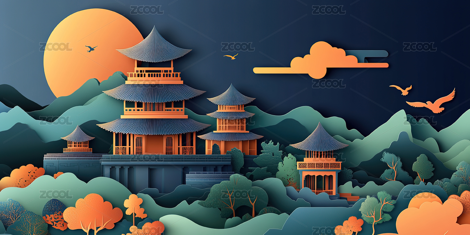 国风,剪纸,山水,中秋,月亮,中国风,扁平,楼宇,建筑,剪纸风