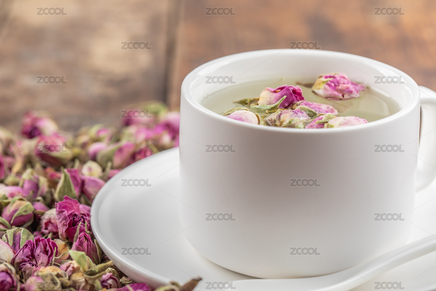 白色茶杯里泡好的玫瑰花茶和干玫瑰花