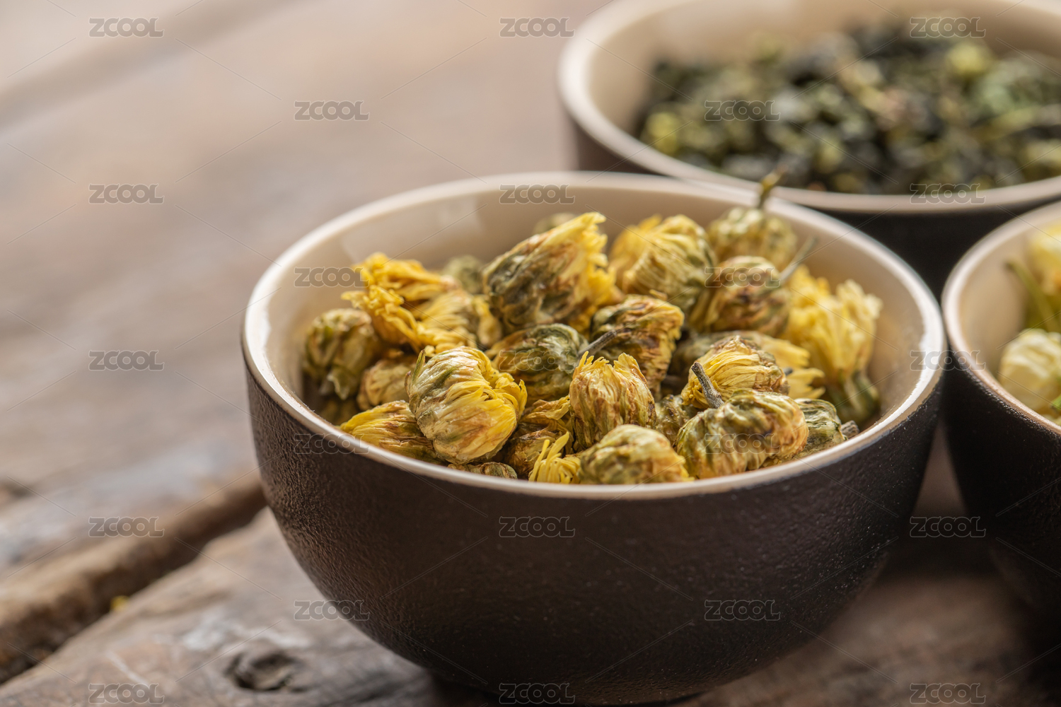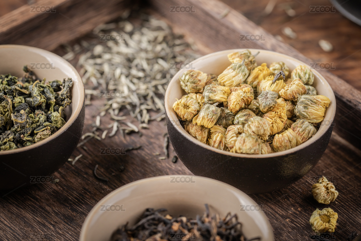 木质桌子上容器内多种多样的茶叶