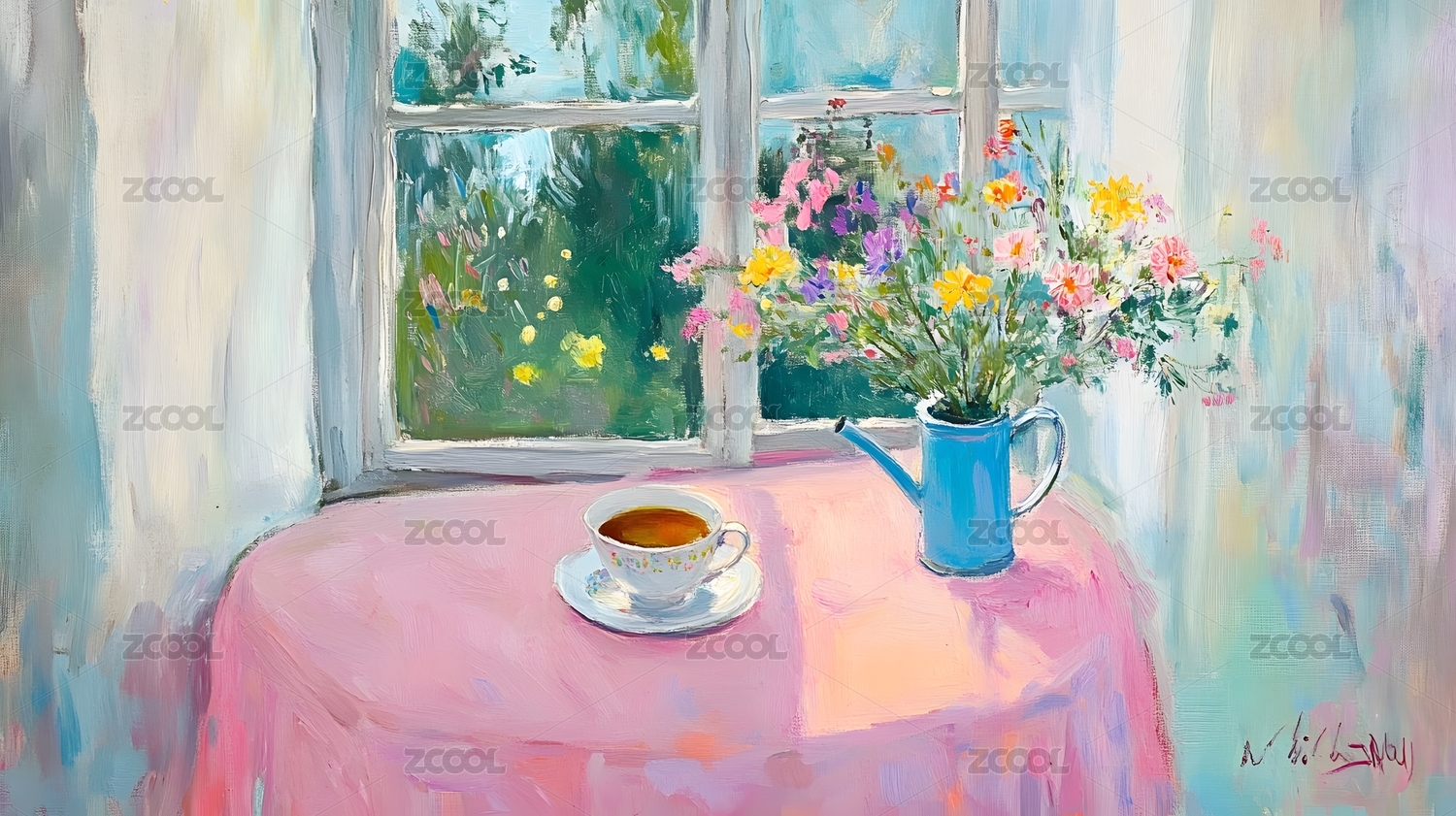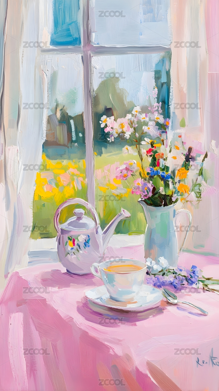 花卉,田园,自然,温馨,艺术,水彩画,油画,茶杯,水壶,窗景