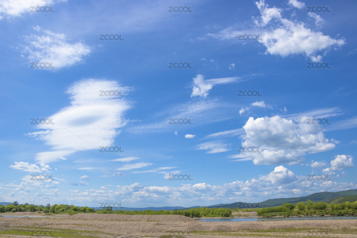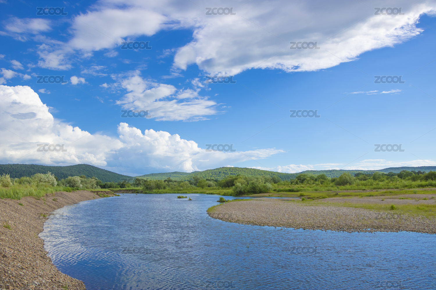 中国大兴安岭湿地的河流、沙滩、植物和云