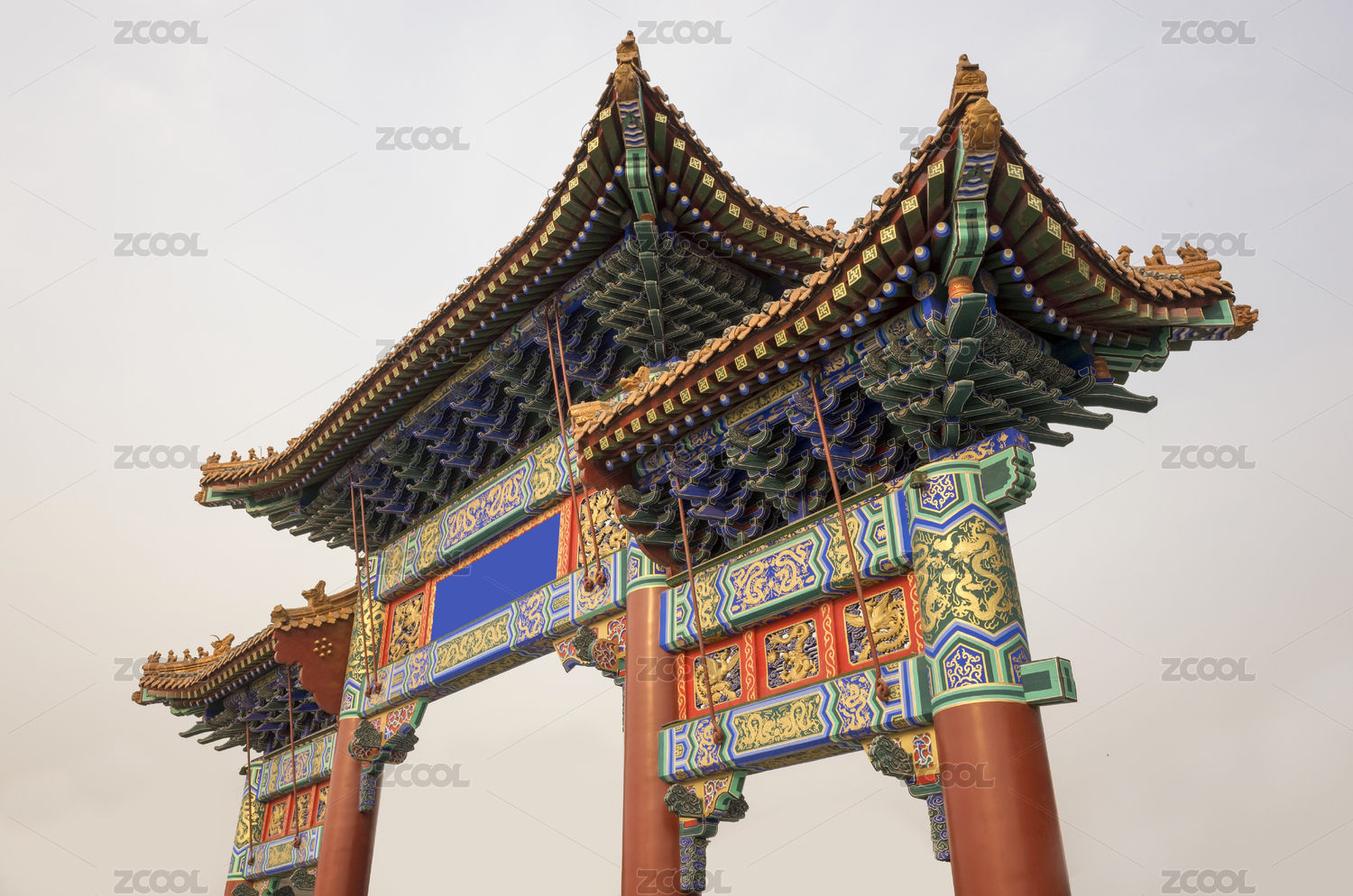 吉林市炮台山上蓝天白云下的琉璃瓦凉亭