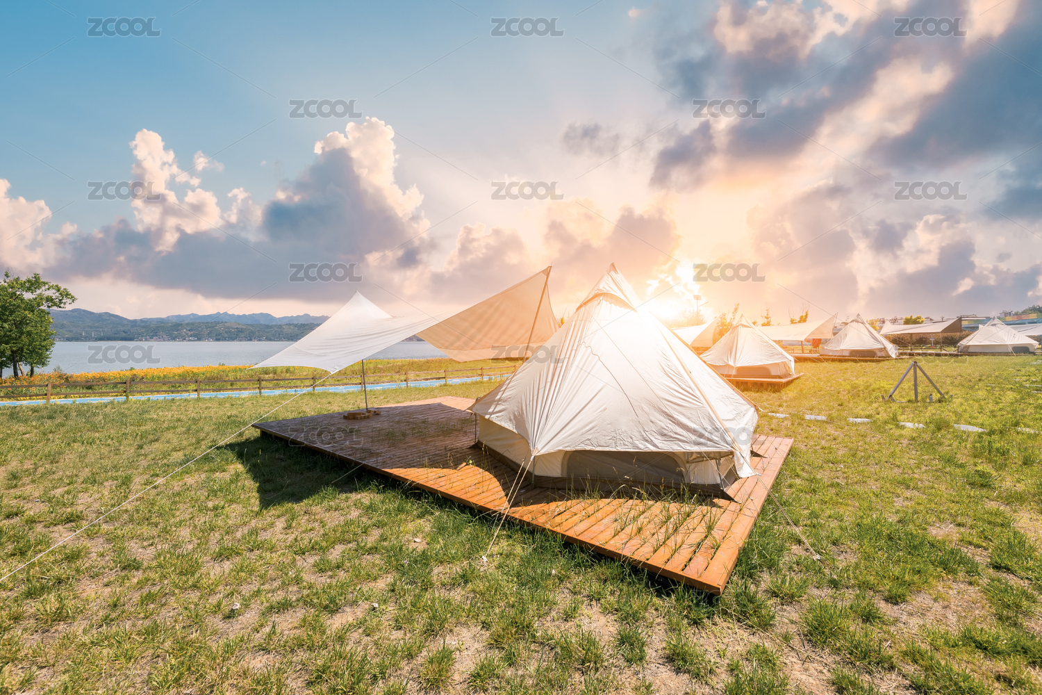 夕阳下的湖边帐篷露营地