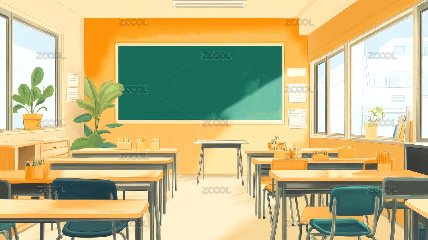 黑板前面桌子上放着地球仪书本苹果咖啡格尺
